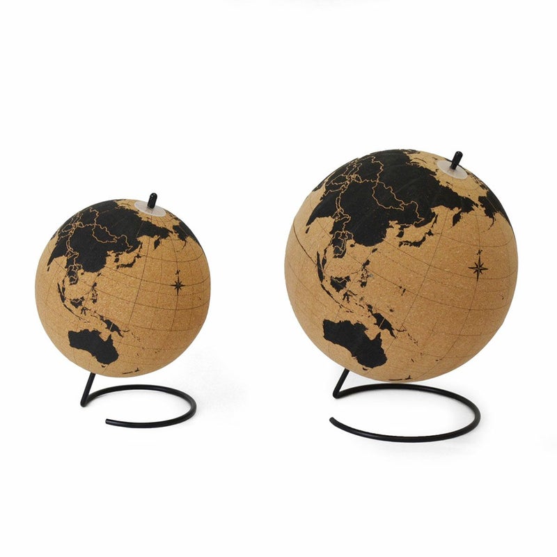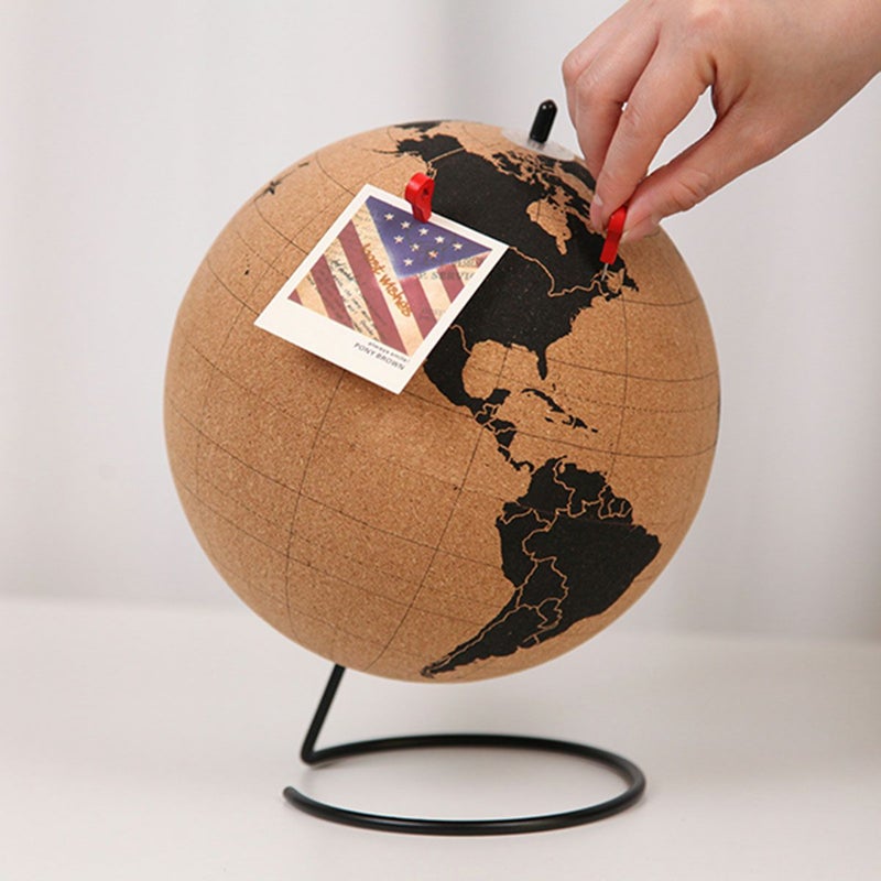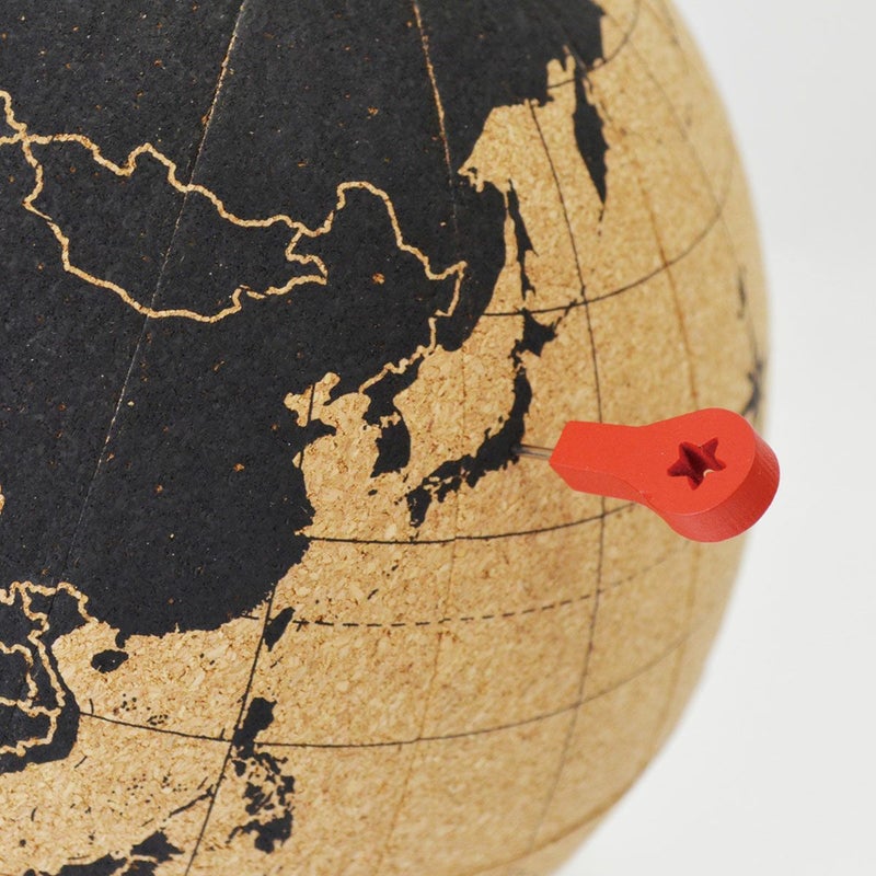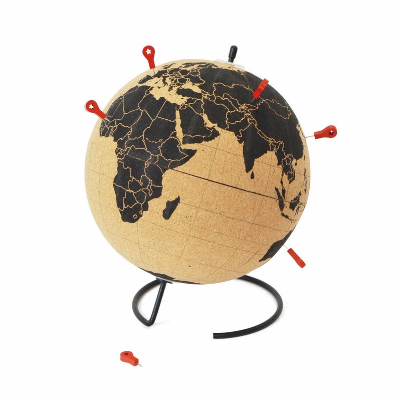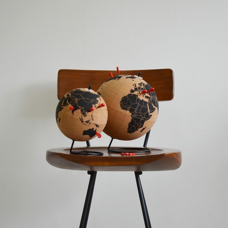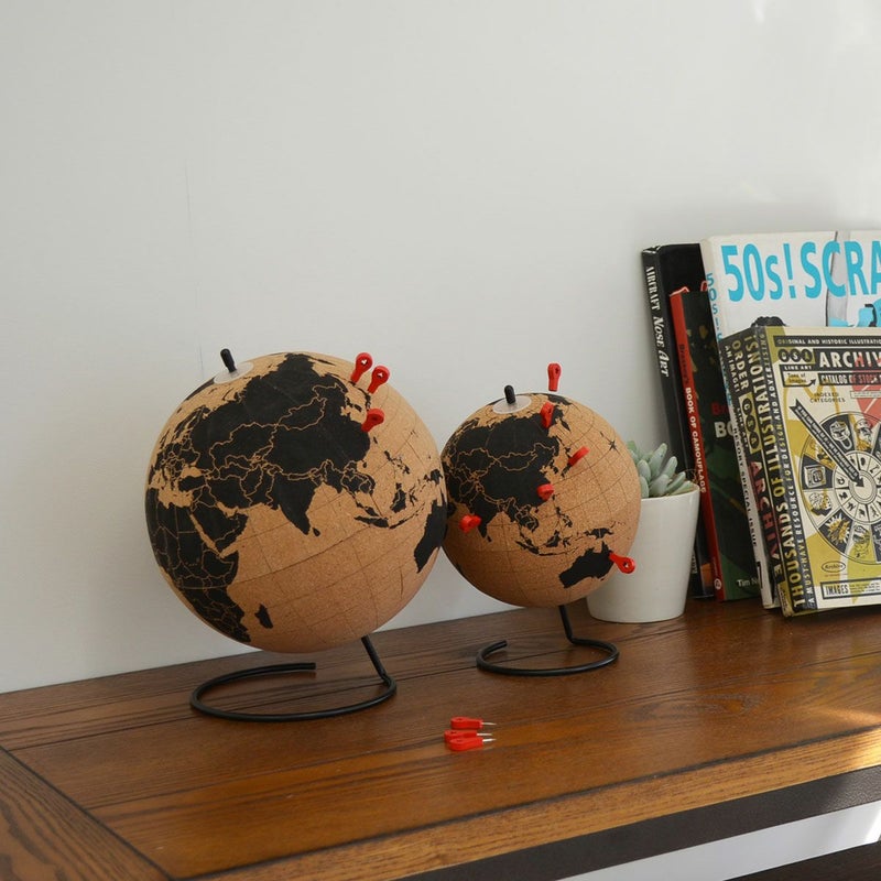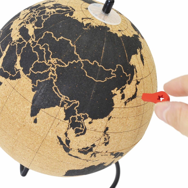 コルク製の回転地球儀。付属のプッシュピン10本でマークできたり、メモをつけたりすることができます。