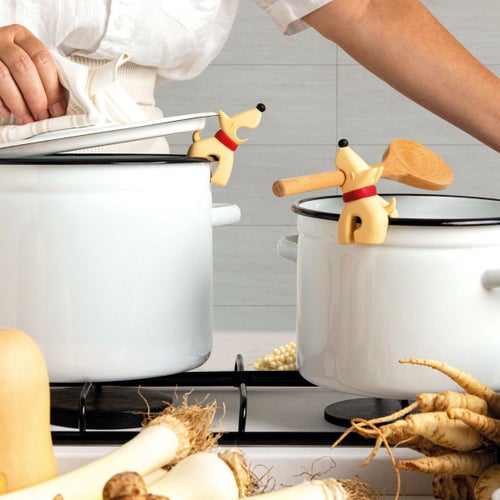 わんちゃんが、調理スプーンを加えてホールドしてくれたり、お鍋のふちに取り付けることで噴きこぼれを防いでくれます!