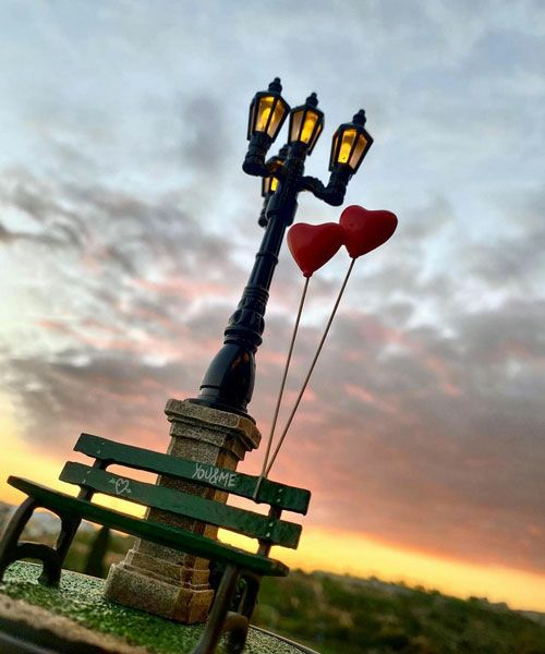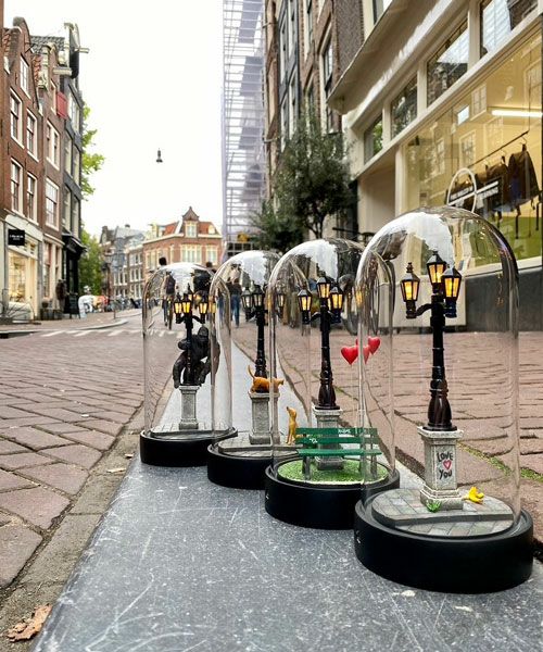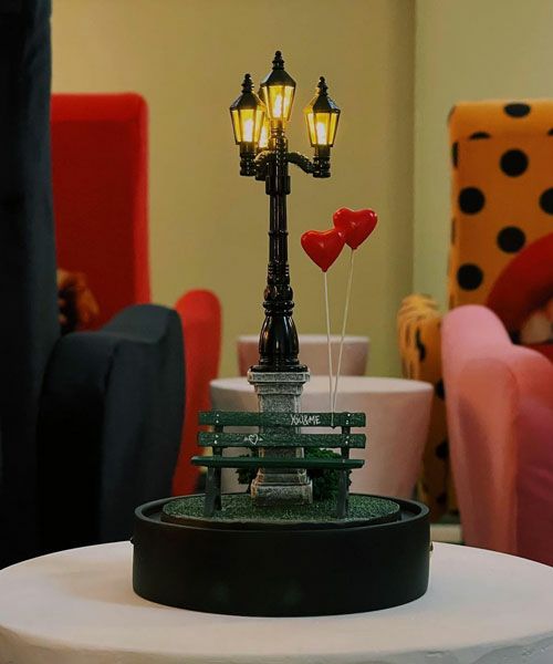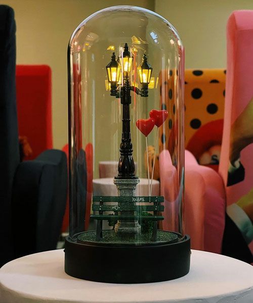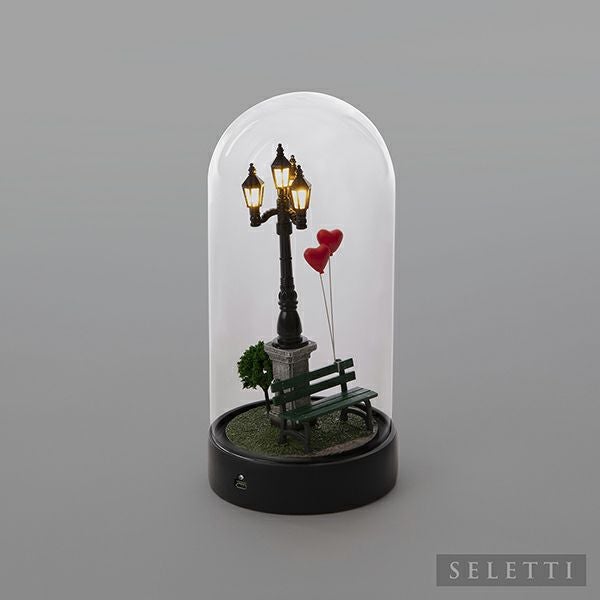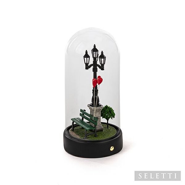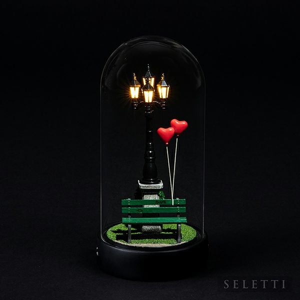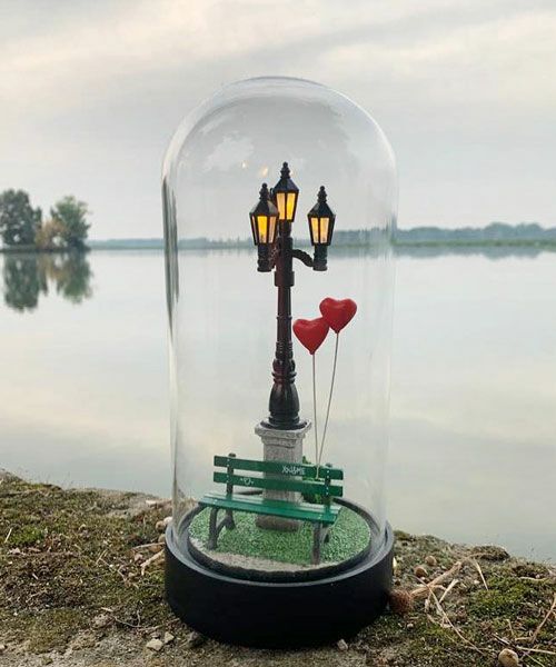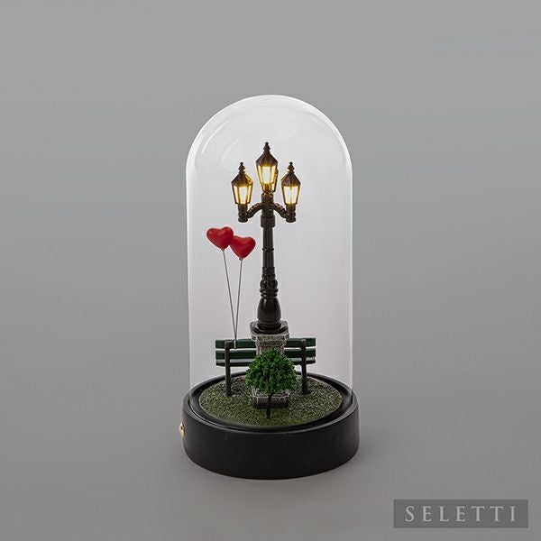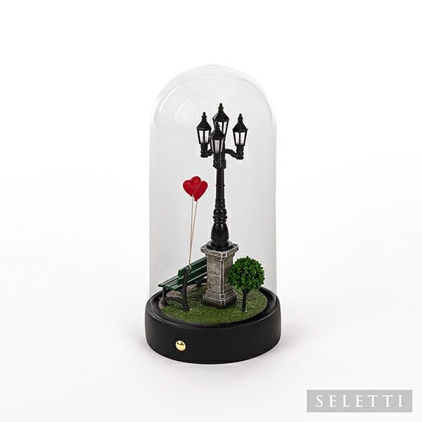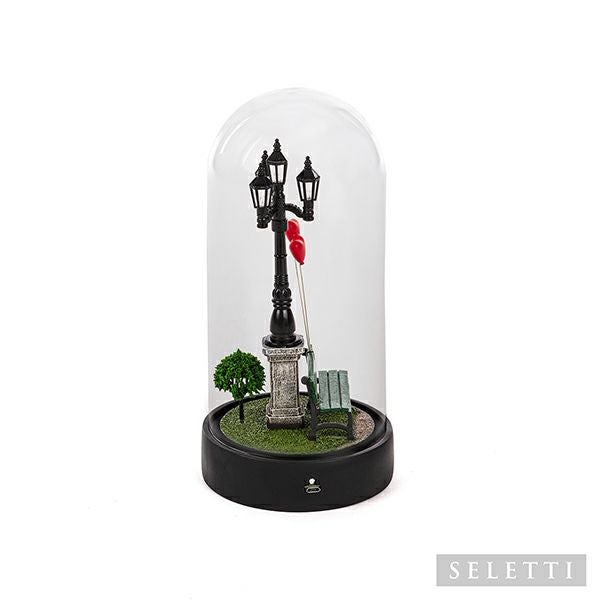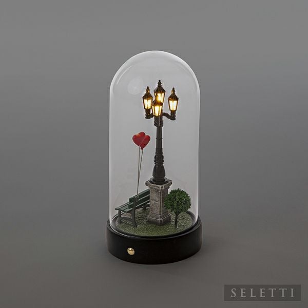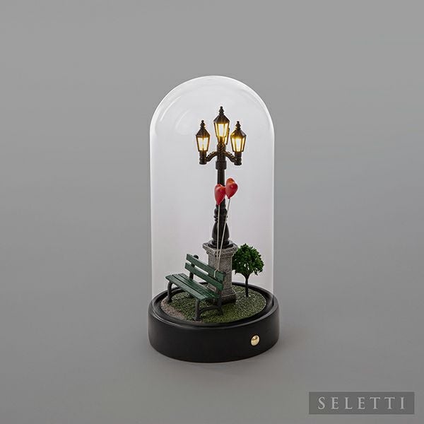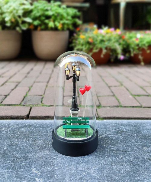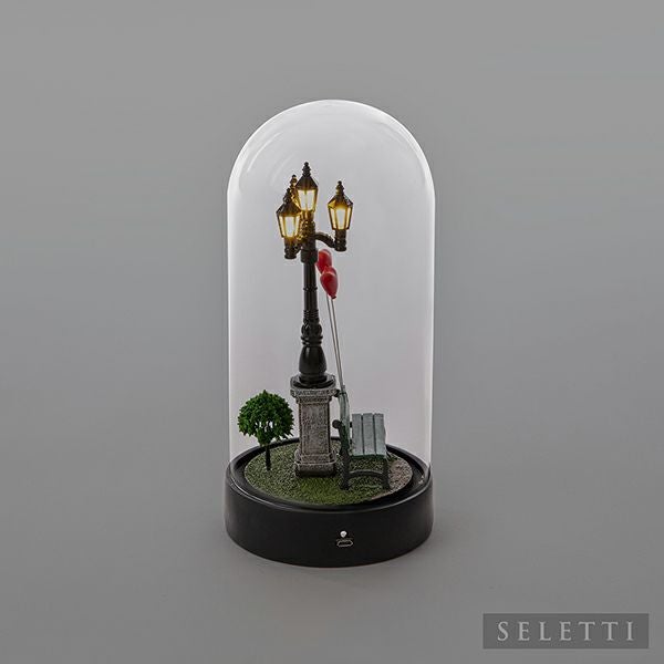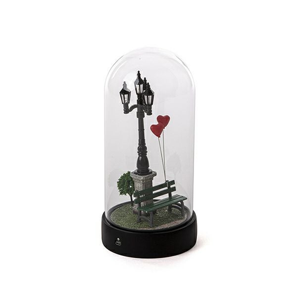 映画のワンシーンを切り取ったような世界をドームの中に閉じ込めたドーム型のランプ。