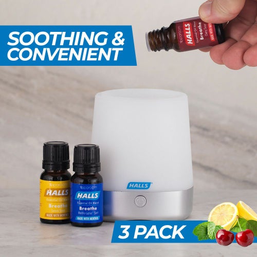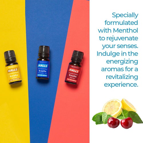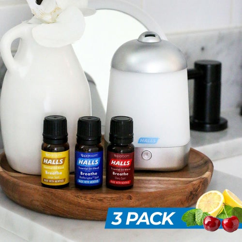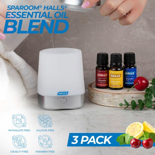 HALLSの咳止めドロップのクラシックなフレーバーからインスピレーションを得て、 SPAROOMと独自のブレンドをした100%のエッセンシャルオイル アロマディフューザーなどにそのまま精油を垂らして使えます。 メントリプチュス・レモン・チェリーのエッセンシャルオイル3本セット。 深い呼吸へと導いてくれるので花粉などのアレルギーや、鼻づまり、眠れないときやリフレッシュにもオススメです。 SPAROOM×HALLS 【ミニスパミストエッセンシャルオイルディフューザー】 と合わせてお使いください。