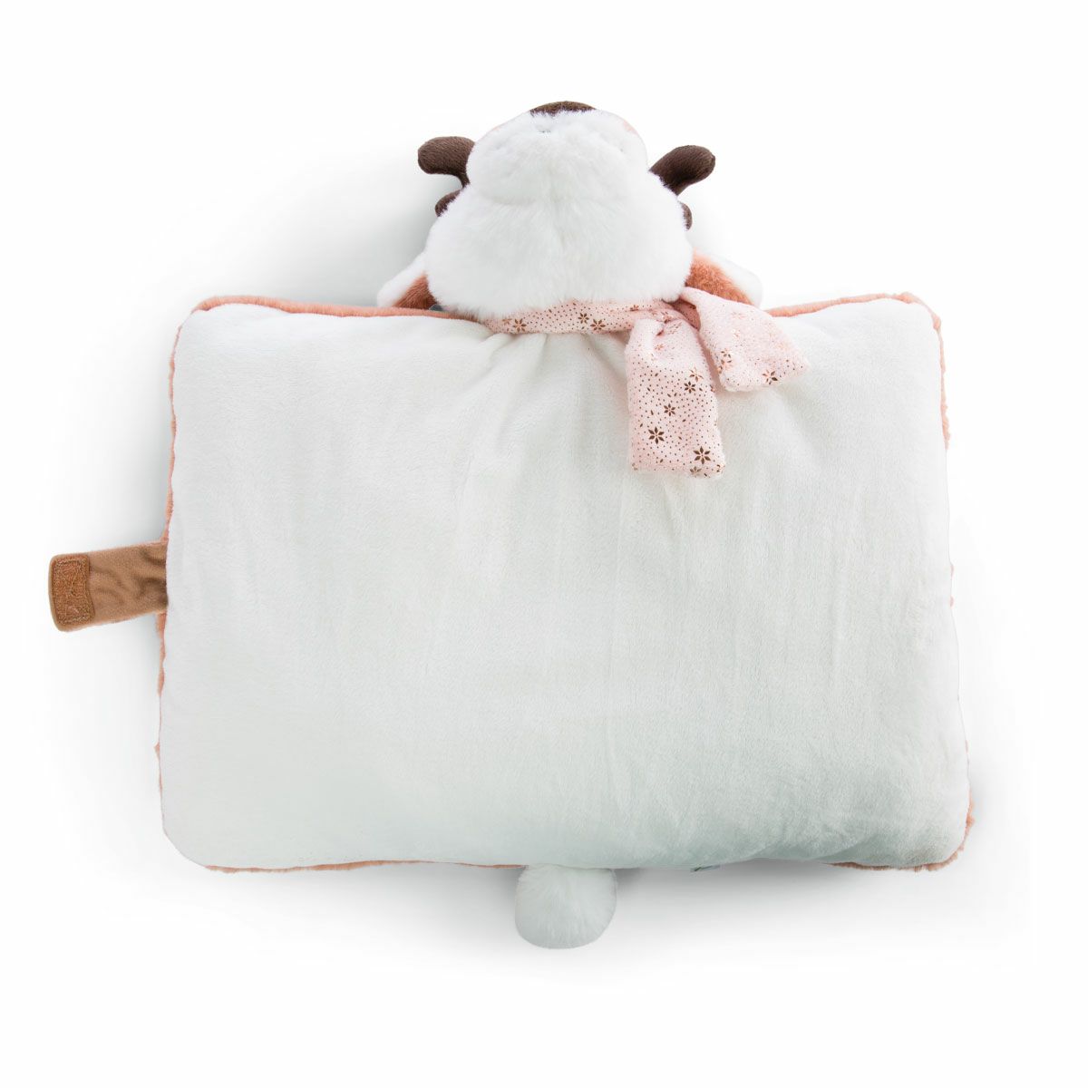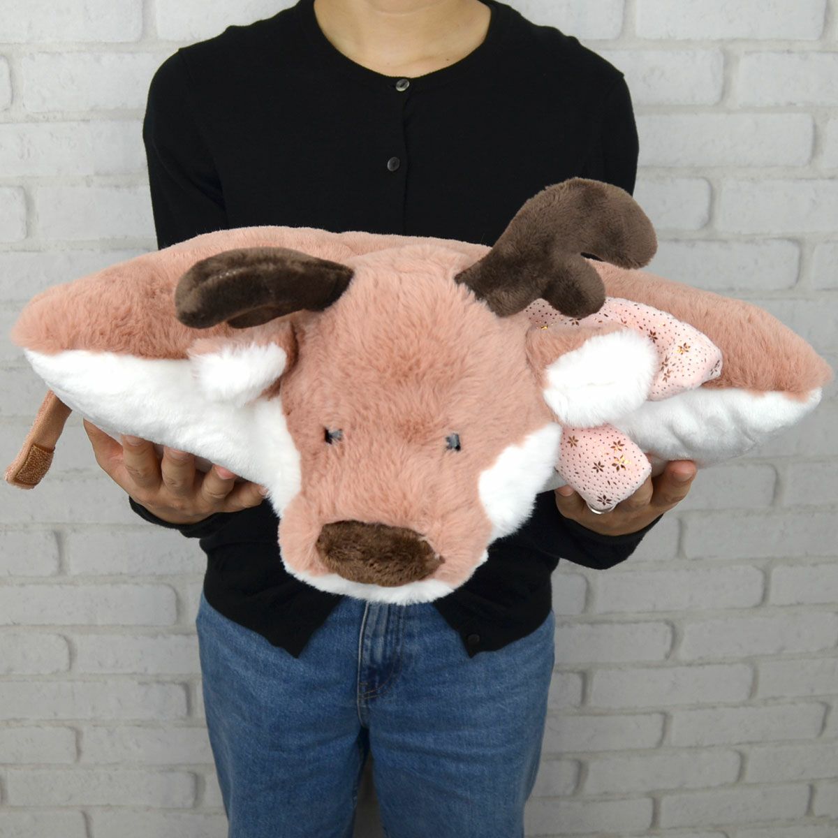 折り畳めばぬいぐるみのような立体形のピロー(まくら)になり、マジックテープを外せば広げてシートクッションとして使用することもできます。