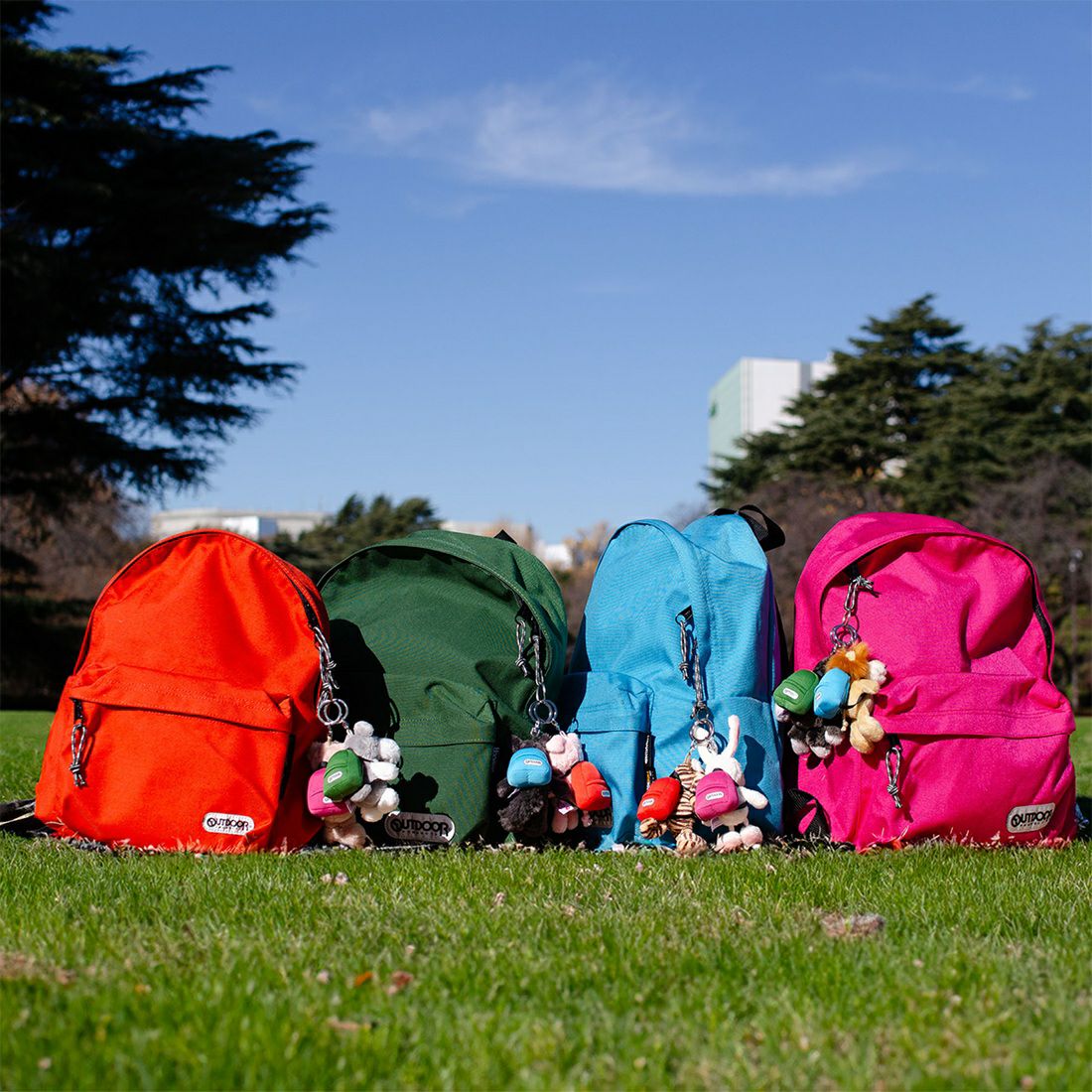 8種類のNICIの人気キャラクターが、OUTDOOR PRODUCTSのデイパックを背負ったぬいぐるみキーホルダー。