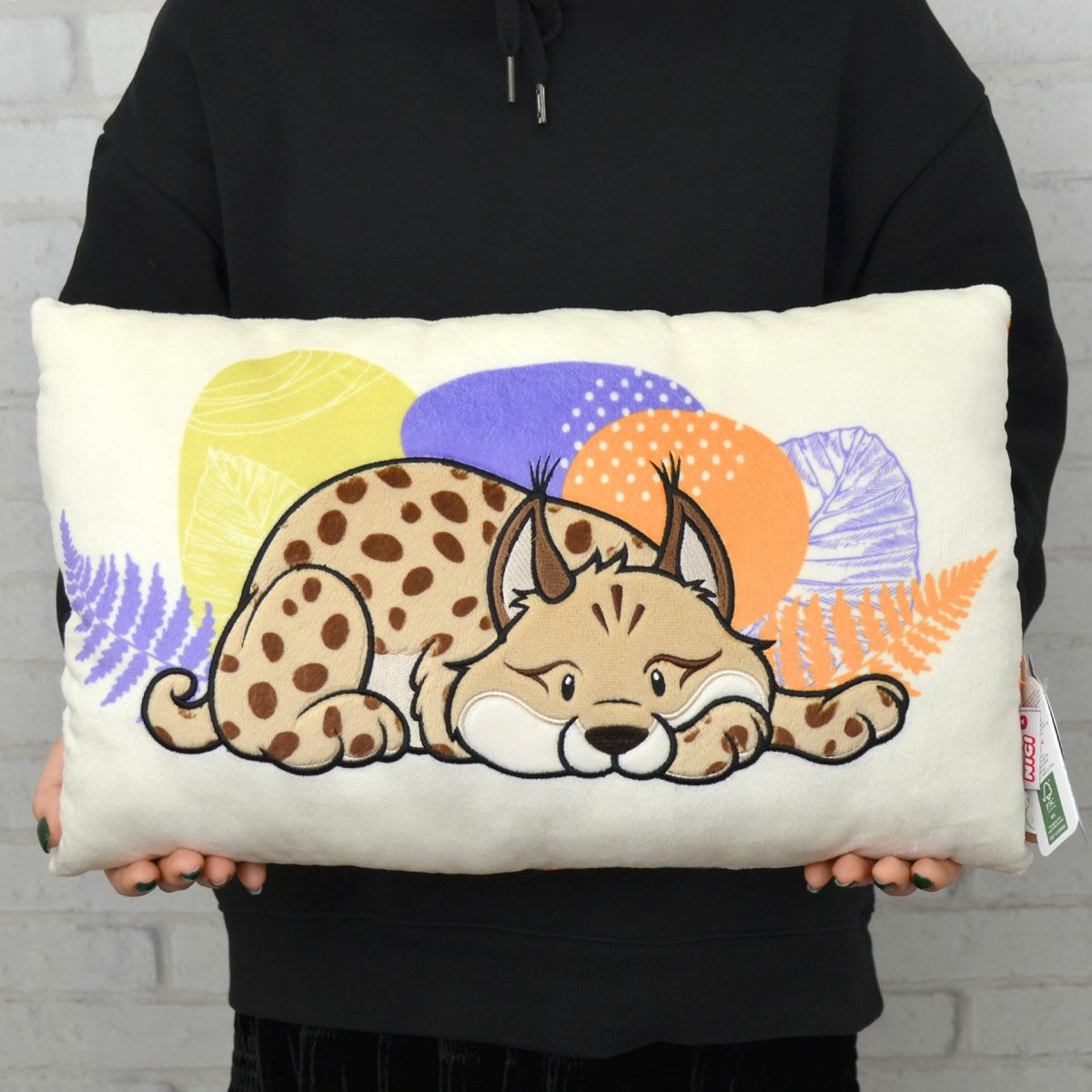 こちらは、ぬいぐるみの肌触りをそのまま残した、オオヤマネコ ライカの長方形タイプのクッションです。
