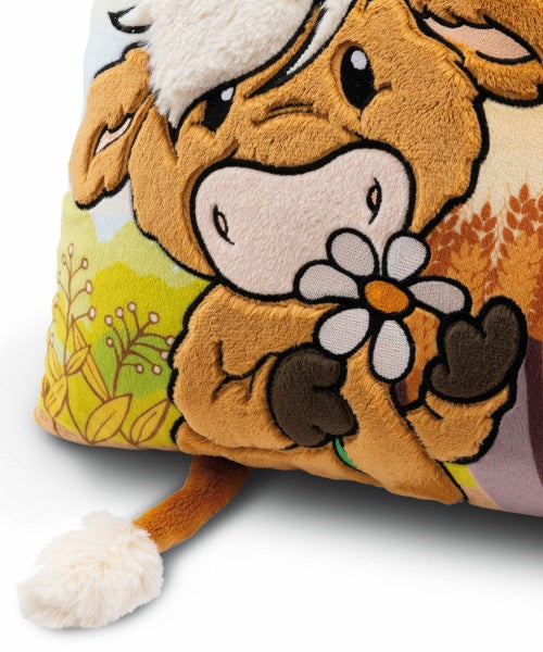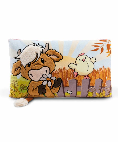 こちらは、ぬいぐるみの肌触りをそのまま残した、ウシ&ヒヨコの43cm×25cmのクッションです。