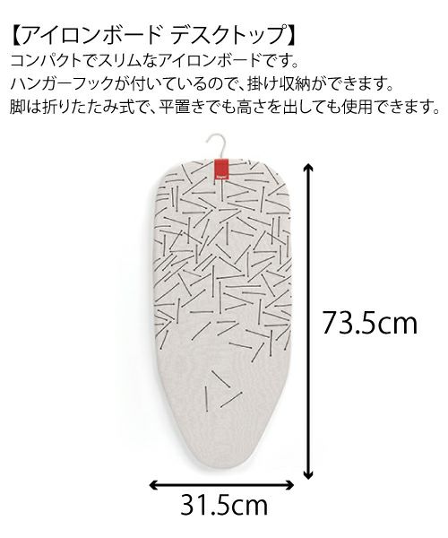 ハンガーフックが付いているので、ウォールハンガーにかけたりクローゼットに衣類と一緒にかけたりと、省スペースに収納できる、コンパクトでスリムなアイロンボードです。 脚は折りたたみ式で、平置きでも高さを出しても使用できます。 通気性の良いフェルトとコットンの2 層構造のカバーが装着されています。