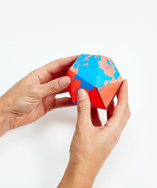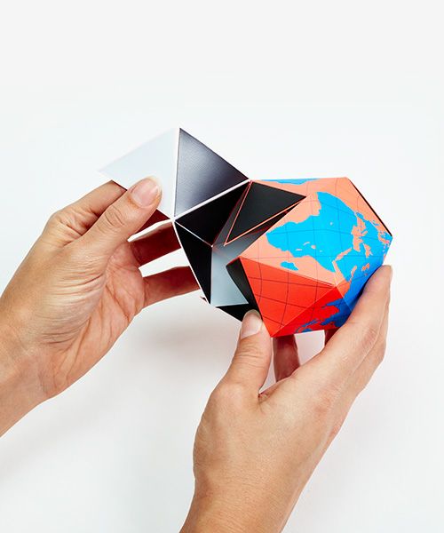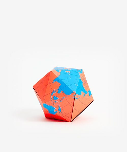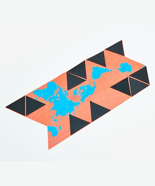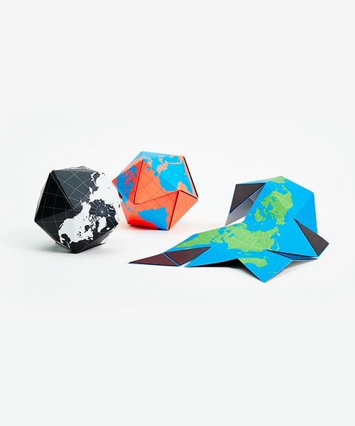バックミンスター・フラーが特許を取得した世界地図「ダイマクションプロジェクション」。AREAWAREはフラーの平面地図を三次元に表現出来る折り畳み式の地球儀を作りました。