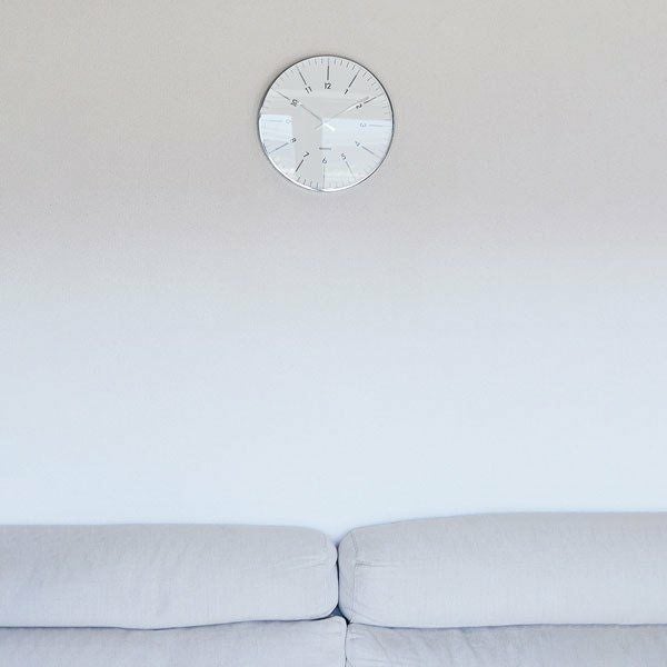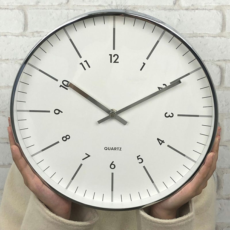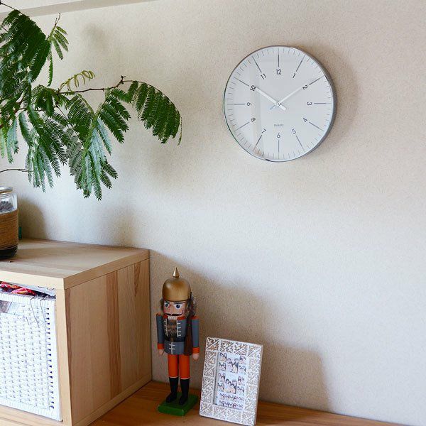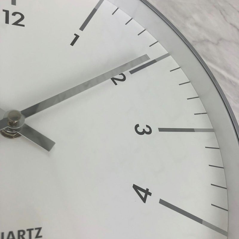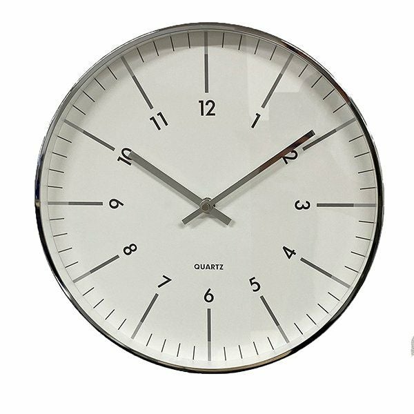 放射状に数字が傾けられたスタイリッシュなデザインの掛け時計です。 縁と針はシルバーメタルで、文字盤はガラスで覆われています。 シンプルなデザインですので、ご自宅だけでなくオフィスでのお使いにもおススメです。 秒針はありませんが、時計のムーブメントはステップ式です。 ※ご使用の際は単3電池1本が必要です。(別売)