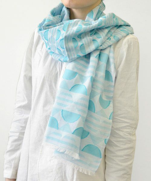 アサガオモチーフの幾何柄を綿100%のストールに織り上げました。カットジャカードという技法を使い、凹凸感を出しているため、巻いた時の柄の立体感がとても美しいストールです。肌触りもよく、手洗いもOKです。(兵庫・西脇)