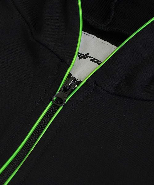 日中はシンプルな黒いパーカーですが、日が沈んで暗くなれば、LEDを光らせて周囲に認識させることができるので、暗い夜道も安心です。