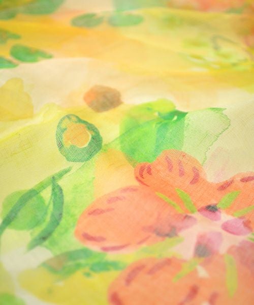 ざっくりした麻の素材に、大胆な水彩の花柄をプリントしました。顔周りを華やかな印象にします。大きめなスクエアなのでアレンジもしやすくギフトにもぴったりです。(大阪)