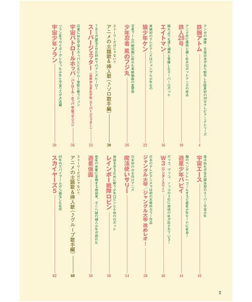 懐かしい昭和のアニメ番組の最終話を余すところなく紹介。1960年代を中心に30作品以上を掲載。エイトマン、ジャングル大帝、サイボーグ009など大人気アニメが大集合!