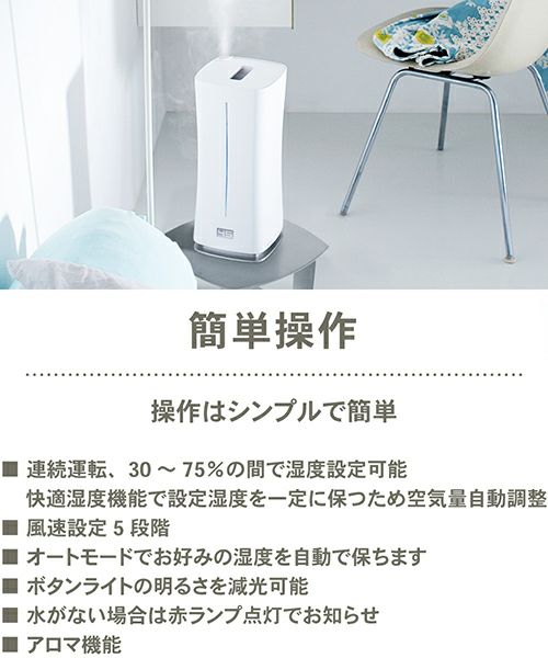 わかりやすいディスプレイと簡単な操作性はもちろん、自動湿度調整機能やアロマディフューザーとしての機能など充実の機能を搭載。