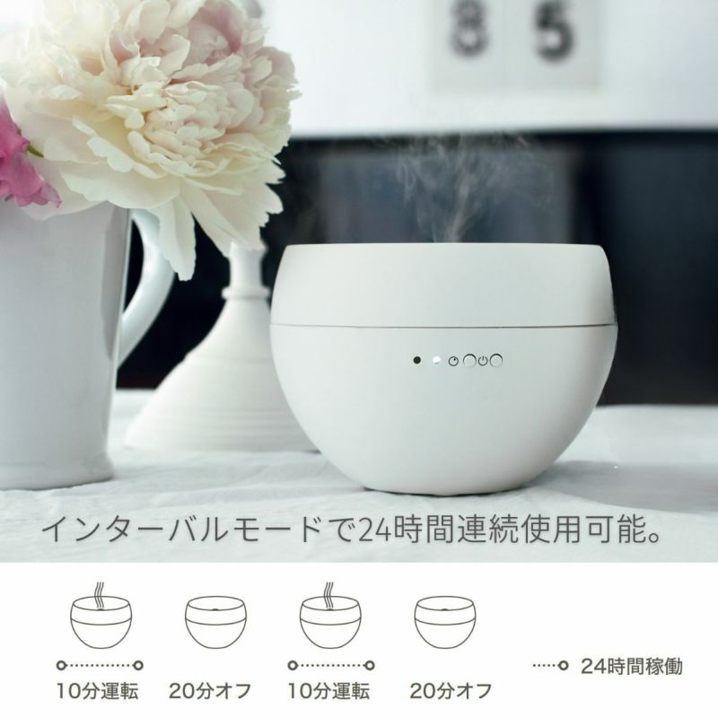 連続稼働約8時間のスタイリッシュな超音波式アロマディフューザー。インターバルモードを搭載し、間隔をあけることで連続運転より長時間稼働します。10分運転、20分電源オフ、10分運転の間隔で稼働し、24時間連続でご使用いただけます。アロマオイルたった2滴で、お好みの香りが24時間持続。 ■消費電力:7.2W ■OFF-ON -インターバル機能付き(10分の運転後20分の停止の機能) ■連続運転時間:ノーマル…8時間 インターバル…24時間 ■タンク容量…100ml