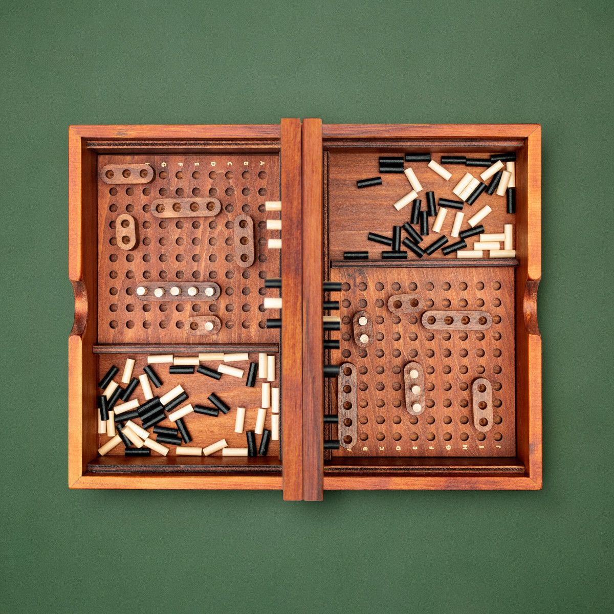 交互にポイントを言い合って、全5船の場所を当てる戦艦ゲーム。 木製で高級感ある仕上がりです。遊ばない時は箱に収まります。