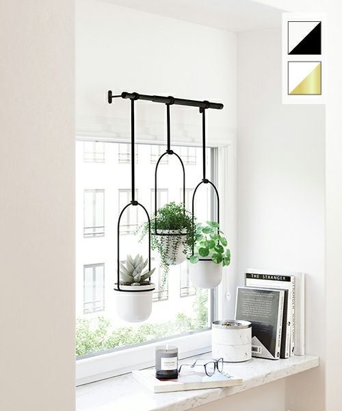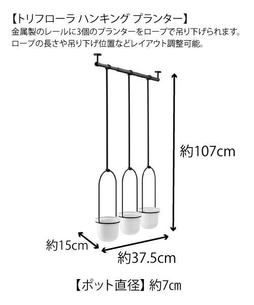 手軽に植物をディスプレイ:トリフローラ プランターは、金属製のレールに3個のプランターをロープで吊り下げることにより、コンパクトなスペースへ手軽に植物をディスプレイすることができます。