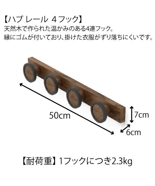 天然木で作られた4連フックです。 フックに黒いゴムの縁が付いているので、ずり落ちにくく、掛けた時の衣服の損傷を防ぎます。 天然木で温かみのある木製のフックは、機能性だけでなく落ち着いた印象を与えてくれます。各フックの最大耐荷重は約2kgです。 衣類やバッグ、アクセサリー等を簡易的に掛けて収納できるので部屋の中をいつもキレに保てます。 玄関、バスルーム、寝室など、様々な場所に最適です。