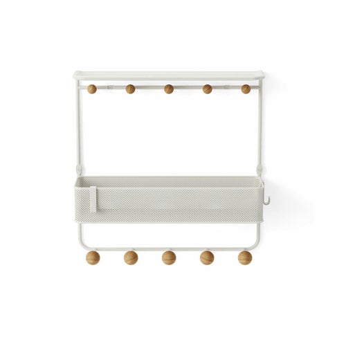 エスティーケは、トップトレイが組み込まれた穴あき金属バスケットと、鍵、メール、ジャケット、バッグ、その他の日常の必需品を収納するための10個のフックを備えています。