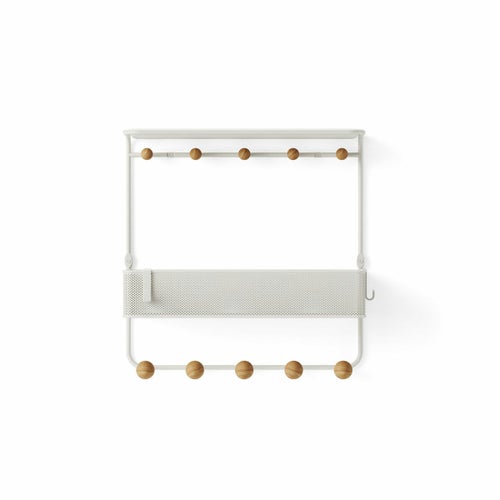 ユニークな多目的ストレージソリューション:エスティーケは、穴あき金属製のビン、木製のノブが付いた10個のフック、および統合されたトレイを備えています。総重量容量18kg