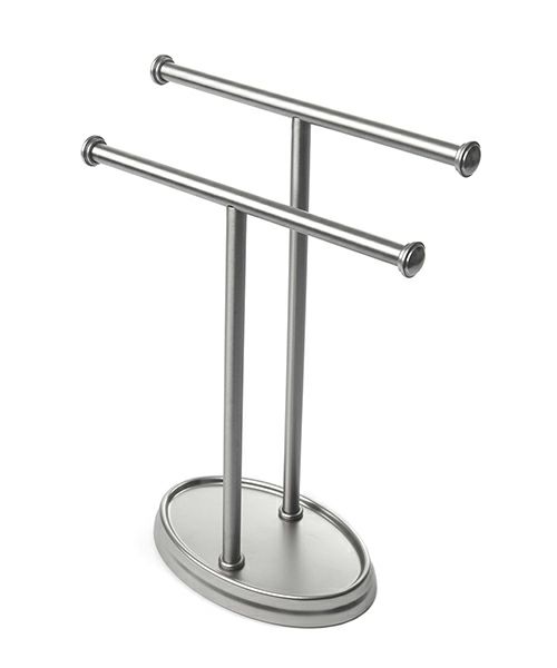 タオルツリーには、2枚のタオルを快適に掛けるスペースがあるだけでなく、小さなアイテムを収納するためのトレイとして機能する便利なベースもあります。