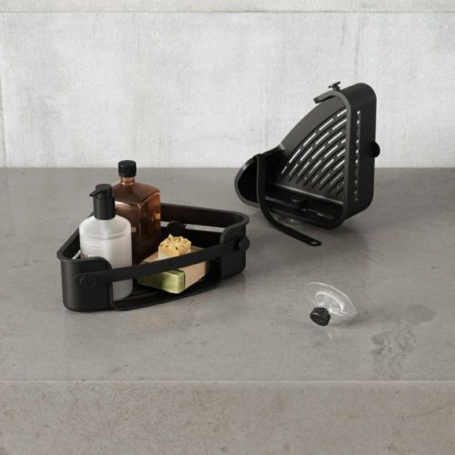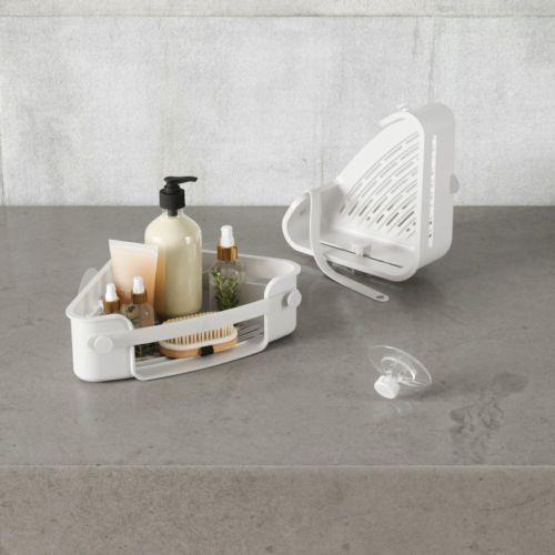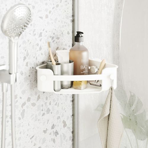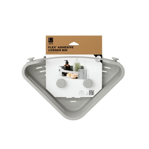 フレックス アドヒーシブ コーナービンは、浴室の十分に活用されていないコーナー スペースを有効に活用します。 取り付けが簡単で、ガラス、鏡、タイルまたは大理石、金属、樹脂板などのさまざまな表面に対応している防水の粘着テープが含まれています (多孔質の表面には機能しません)。シャンプー、コンディショナー、ボディ ウォッシュ、カミソリ、ヘチマとウォッシュ クロス用の 2つのフック用のスペースがあります。 排水穴が組み込まれており、キャディから水を排出できるため、清潔で乾燥した状態を保つことができます。サイズは32.5 x 19 x 8.6 cmです。 耐荷重は3kgです。Umbra のフレックス アドヒーシブ バス コレクションの一部です。