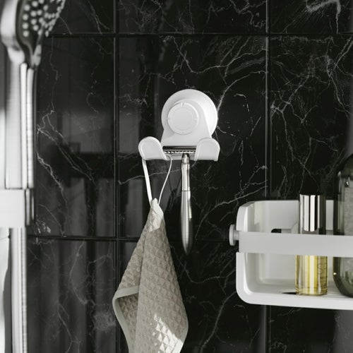 フレックス アドヒーシブ ダブルフックで、小さなバスルームの必需品を引っ掛けて簡単にアクセスできるようにします。