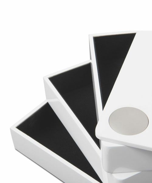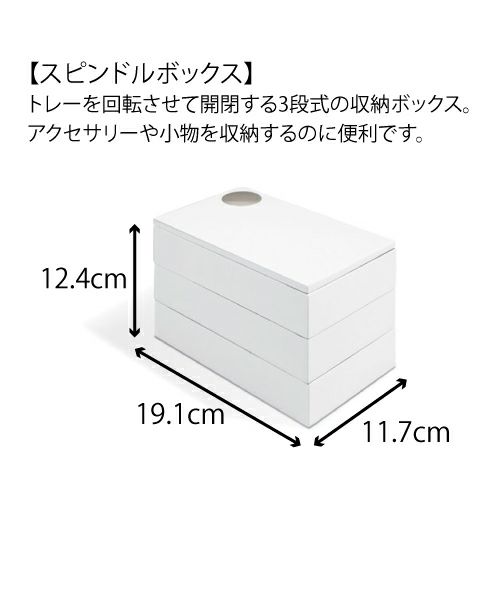 DESIGN:TOM VINCENT トレーを回転させて開閉するスピンドルボックス3段式で、全てフリースペースなのでアイデア次第で色々と収納できる散らかりがちなアクセサリーや小物を収納するのに便利です。