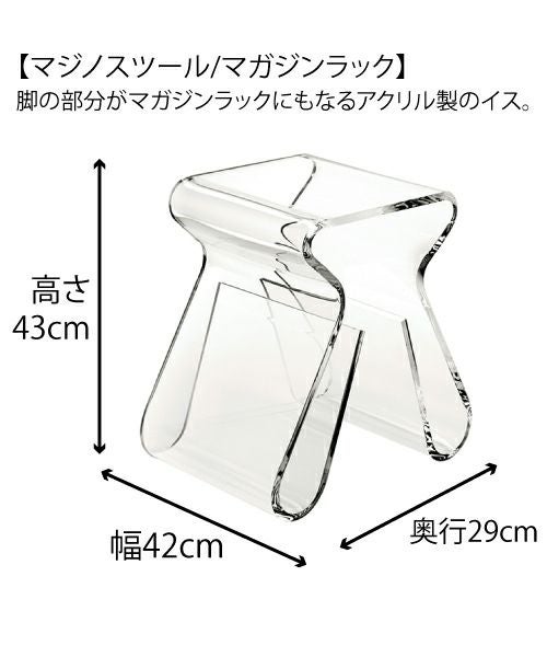アクリル製のイスです。脚の部分はマガジンラックとしても活躍します。 *こちらの商品はラッピング対応不可となります。予めご了承ください。