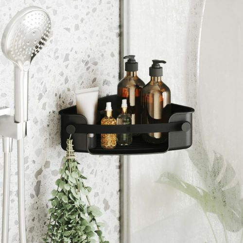 フレックス アドヒーシブ コーナービンは、浴室の十分に活用されていないコーナー スペースを有効に活用します。 取り付けが簡単で、ガラス、鏡、タイルまたは大理石、金属、樹脂板などのさまざまな表面に対応している防水の粘着テープが含まれています (多孔質の表面には機能しません)。シャンプー、コンディショナー、ボディ ウォッシュ、カミソリ、ヘチマとウォッシュ クロス用の 2つのフック用のスペースがあります。 排水穴が組み込まれており、キャディから水を排出できるため、清潔で乾燥した状態を保つことができます。サイズは32.5 x 19 x 8.6 cmです。 耐荷重は3kgです。Umbra のフレックス アドヒーシブ バス コレクションの一部です。