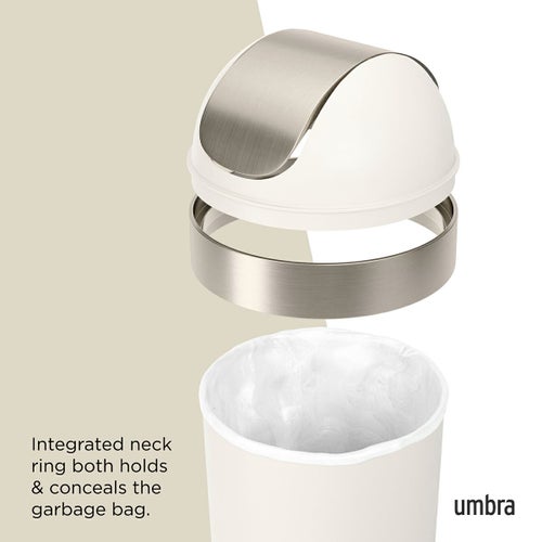 シンプルで清潔感溢れるデザイン:Umbraがデザインしたベンチカンは、シンプルでありながら機能的なデザインで、どんなインテリアにもぴったりです。回転式のふたは使いやすく、ふたと本体の間にあるネックリングはごみ袋をしっかりと抑え、尚且つ目隠しとなりますので清潔でモダンな見た目をキープ出来ます。