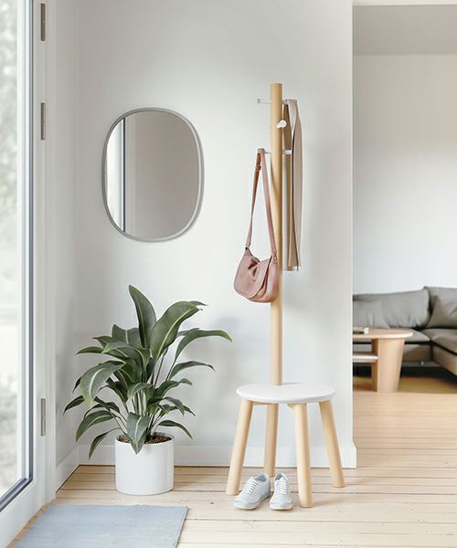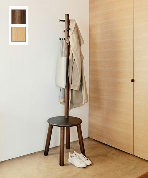 コートラックとスツールを融合したデザイン:従来のコートラックと異なり、バッグや植物を置いたり、または座って靴を履くときに便利なスツールが一体となったユニークなコートラックです。