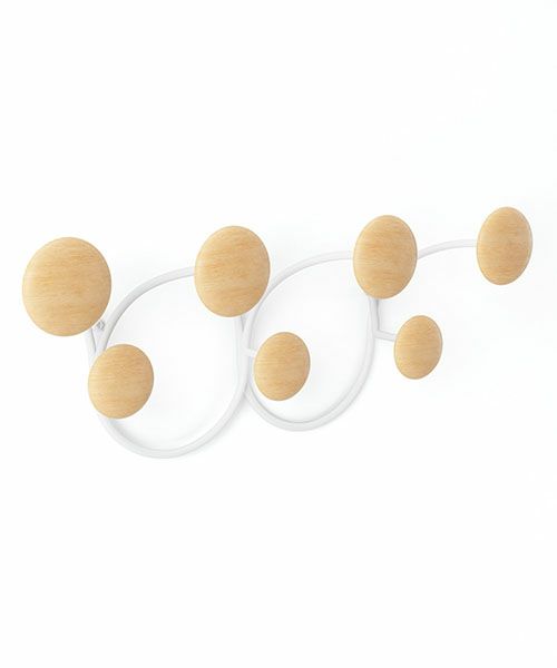 天然木とスチールワイヤーのスッキリとしたデザインのウォールフック。 7つの円形フックにスチールワイヤーを組み合わせたポップなデザインが特徴です。 各フックの耐荷重は2.3 kgです。 ドットの形をしたフックは使用してない時にもインテリアとしてGOOD! 帽子、バッグ、ジャケット、スカーフなどの日用品やアクセサリーを収納するのに最適です。上下交互にフックがあるので従来のフックよりもフック数は変わらず幅が短く設計されています。 付属品:木ネジ、アンカービス