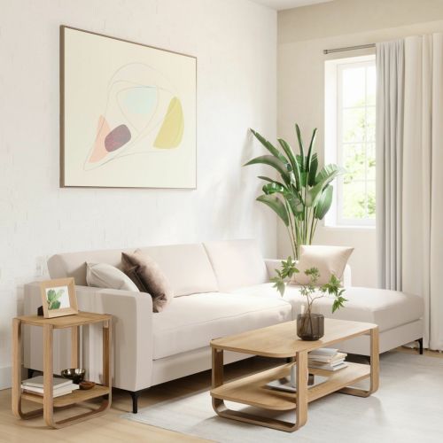 柔らかな木のカーブした脚と2つのオープン棚を備えたベルウッドは、リビングルーム、ベッドルーム、玄関に暖かく風通しの良い雰囲気をもたらします。