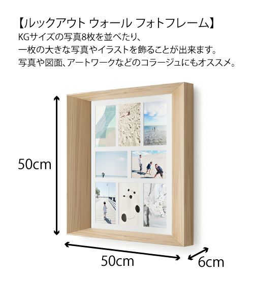 KGサイズ(10.2x15.2cm)の写真8枚を並べるか、ガイドの枠を取り出して45.5x35.5cmサイズの大きな写真やイラストを飾ることも出来ます。