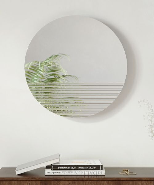 鏡面にリッジ(線)の装飾があるミラーです。 方向はお好みで変えることができるため、鏡面のリッジ(線)がどこに来るかを調整して壁へ取り付けできます。 フチがないので、隅まで映してくれます。 簡単に取付けが出来るようにアンカービスが付属しています。