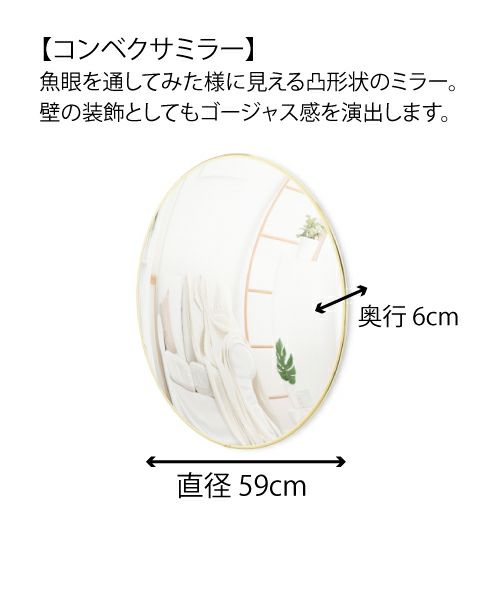 ミラーの形が凸形状のため、まるで魚眼を通してみた様な風景を感じることができます。 ミラーの外側をゴールド仕様のメタリックカラーにしたことで、壁の装飾としてもゴージャス感を演出します。 軽量でガラスの飛散がしにくく、取付けに必要なネジも付属しているので取付けも簡単です。 *こちらの商品はラッピング対応不可となります。予めご了承ください。