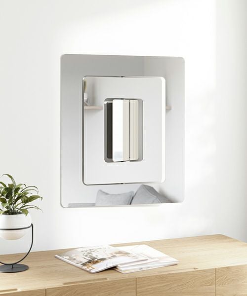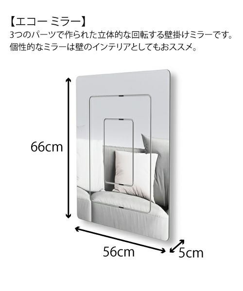 3つのパーツで作られた立体的な回転する壁掛けミラー です。 壁へ取り付けた背板をを軸として3枚のミラーを様々な角度へ回転させることが出来るため、自由な角度で止めておくことができます。 個性的なミラーは芸術作品として壁のインテリアとしておススメです。 エコー ミラーは付属のネジで簡単に取付けをすることが可能です。 *こちらの商品はラッピング対応不可となります。予めご了承ください。