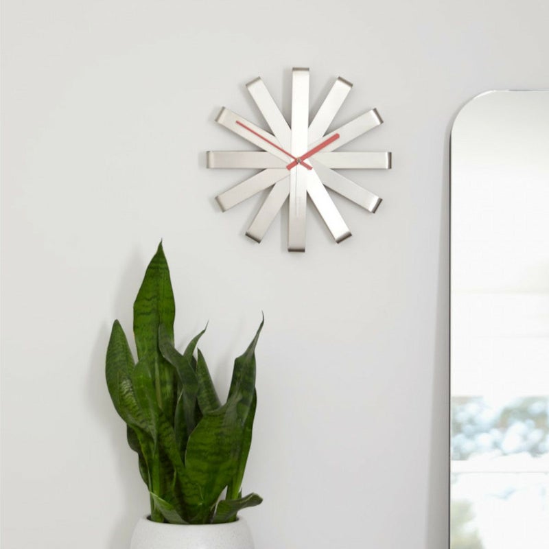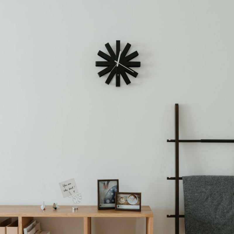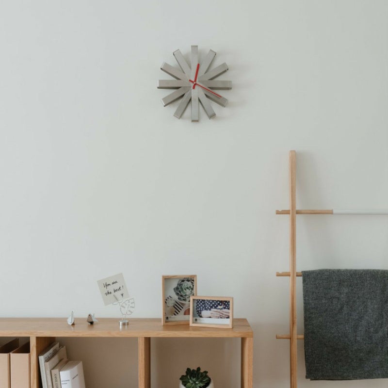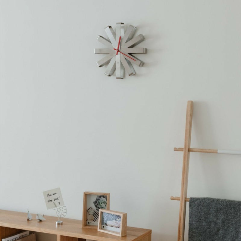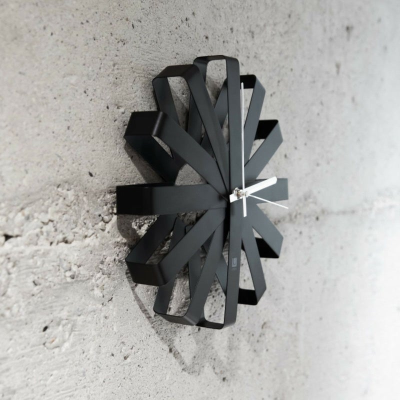 リボンをモチーフにしたことにより、壁の装飾と機能的な時計がスタイリッシュに一体化しました。