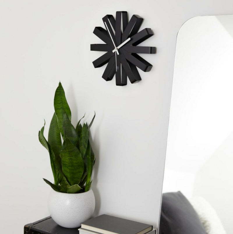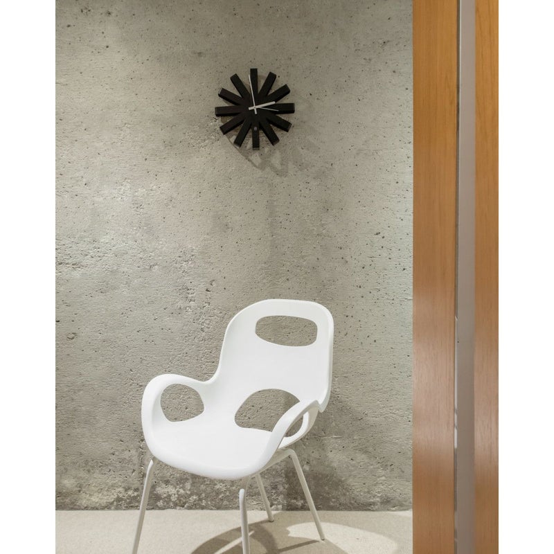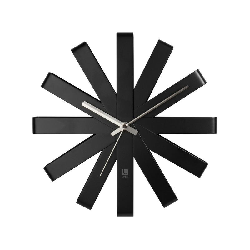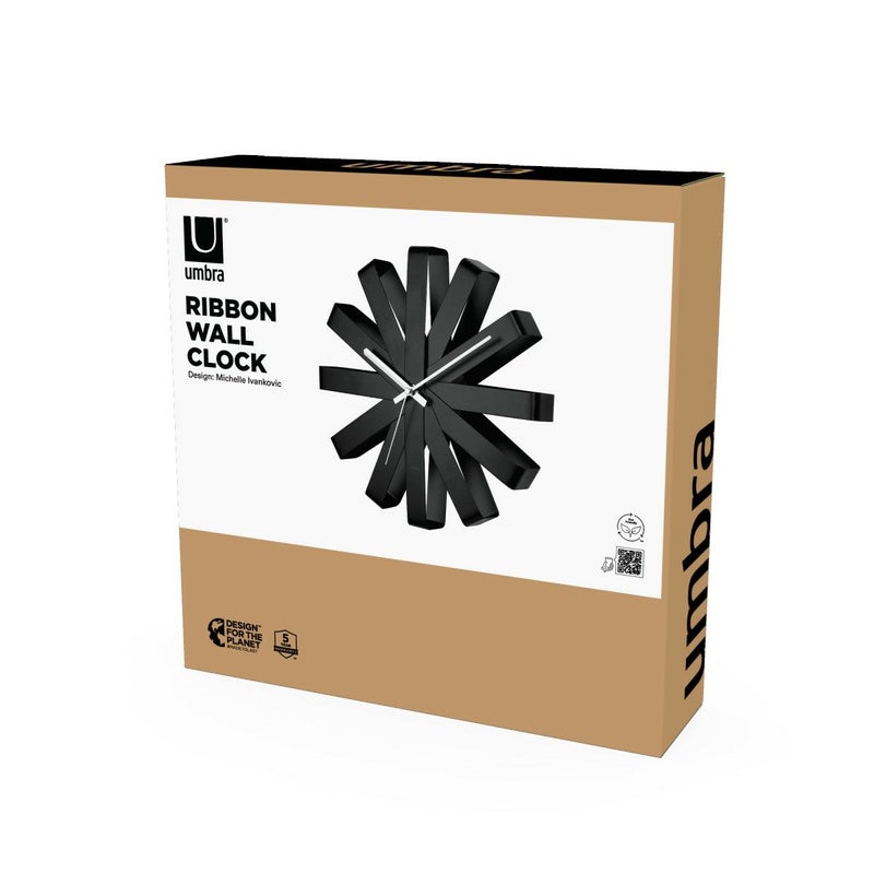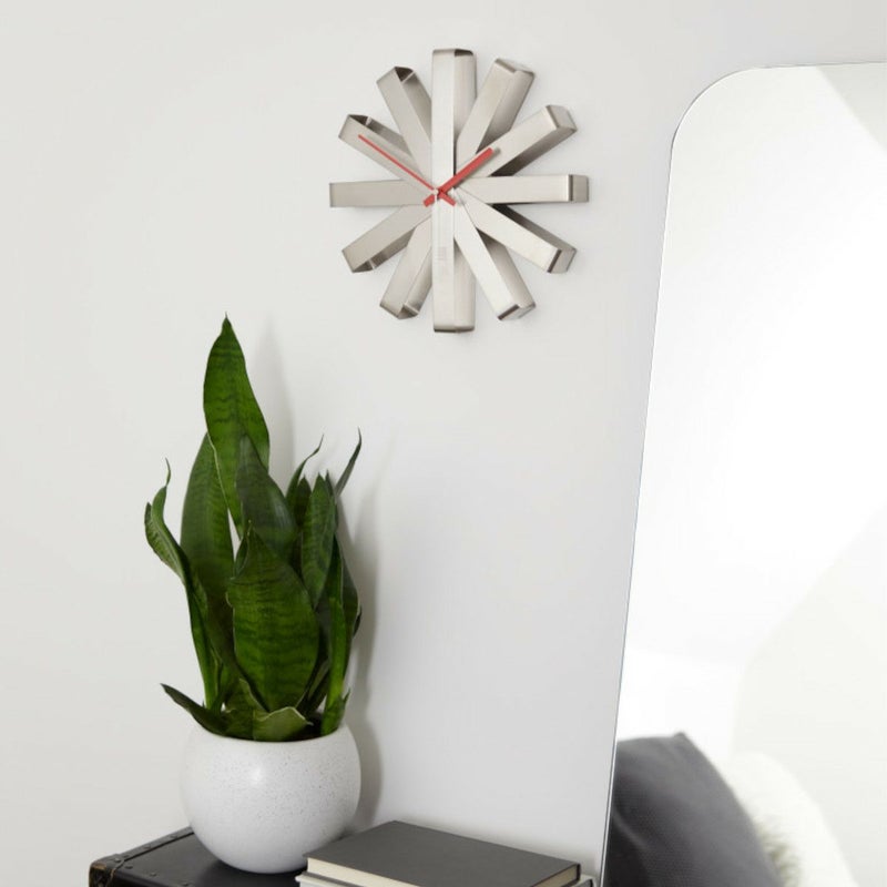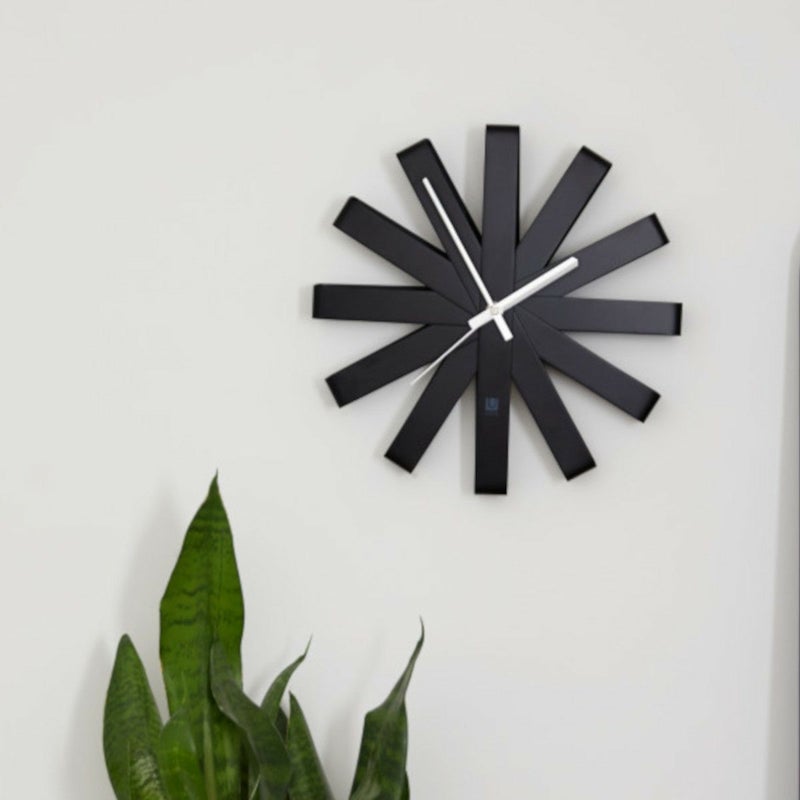リボンをモチーフにしたことにより、壁の装飾と機能的な時計がスタイリッシュに一体化しました。