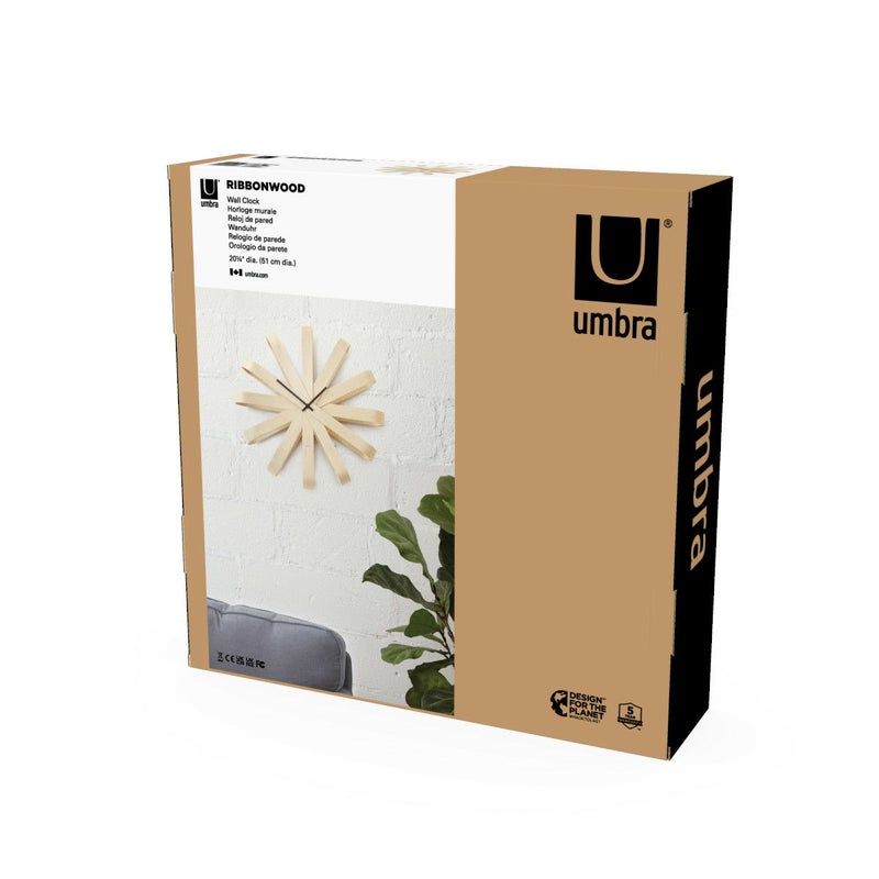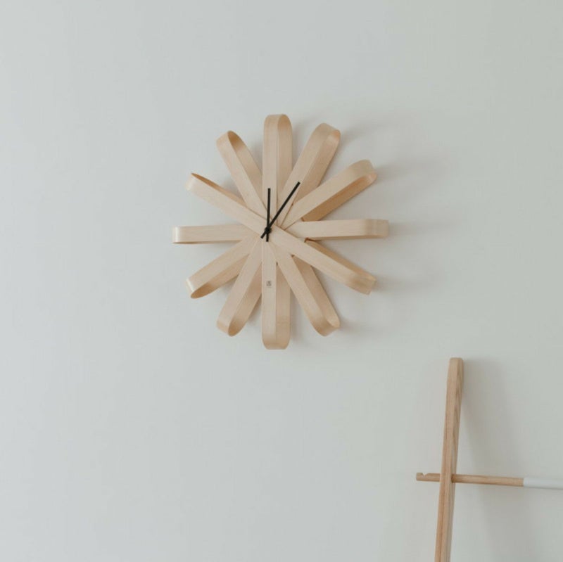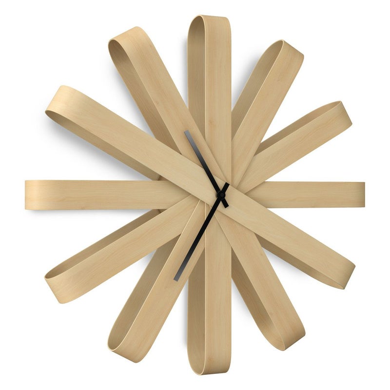 一枚板を曲げて作った綺麗なリボンの形が特徴のリボンウッド ウォールクロックは、軽くてデザイン性のある壁掛け時計です。