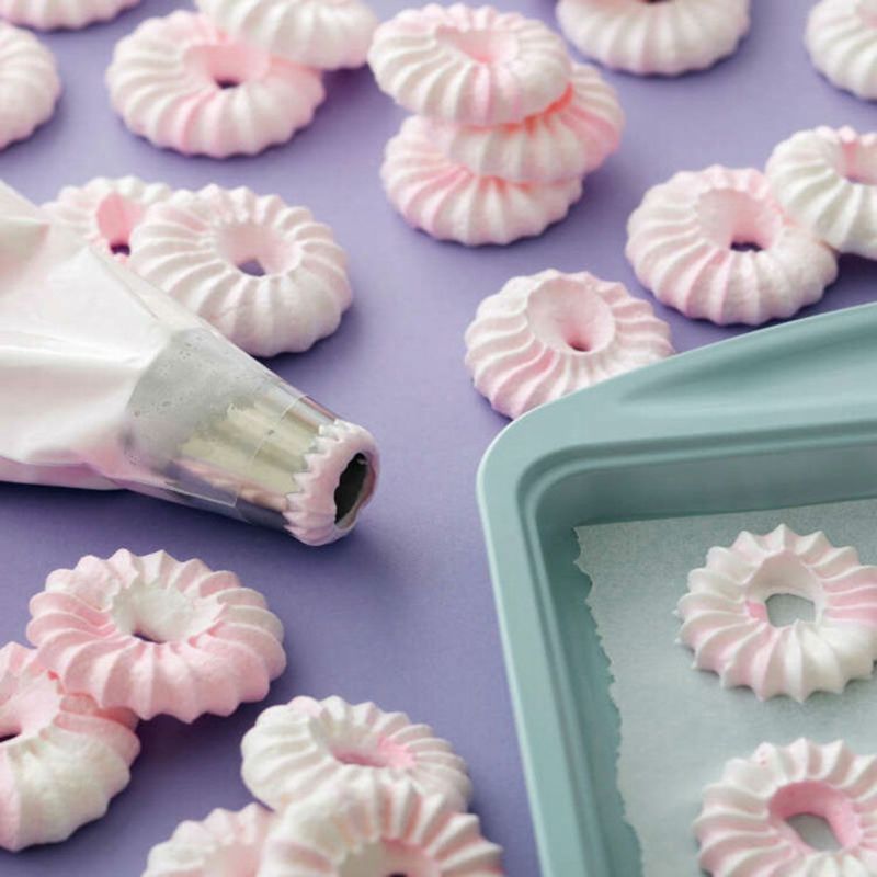 サルタン口金は、フランスの伝統菓子ルリジューズ(Religeuse)という大小のシュークリームを重ねる際、バタークリームを間に絞るのに使われる口金です。 日本ではロミアスと呼ばれるクッキー絞りにも同じ口金が使われることが多く、真ん中にチェリーやジャム、スプリンクル、チョコレートなどを入れたクッキーが人気です。