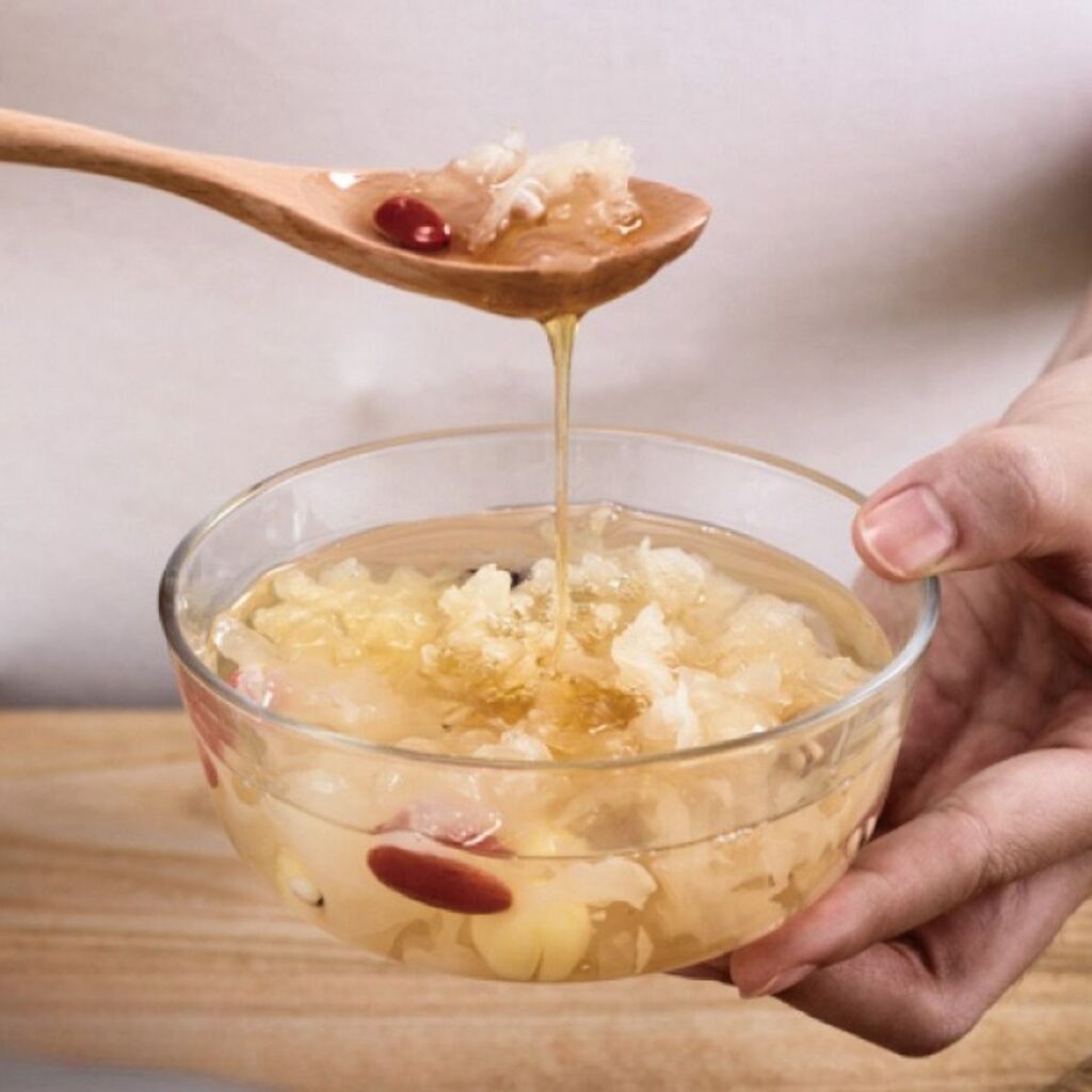 乾燥対策に最適な白きくらげと、喉を潤す梨をコトコト煮込んだ、ほんのり甘いスイーツ薬膳。ガラス越しに見える透明感が宝石のようです。