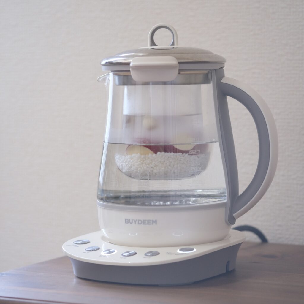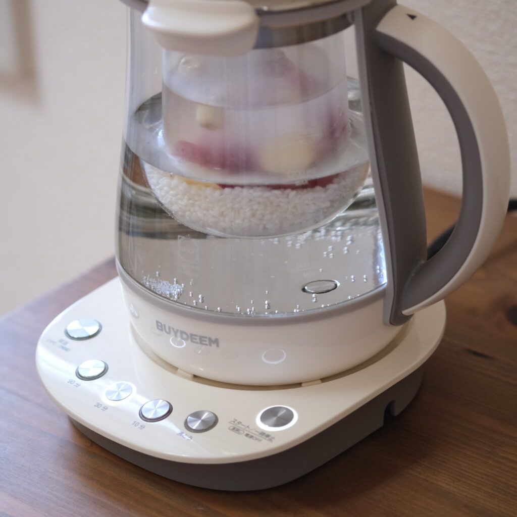❷BUYDEEM薬膳マルチポット本体に1000mlのラインまで水を注ぐ。インナーポットをセットしてAの材料を入れ、蓋をして30分ボタンとスタートを押す。