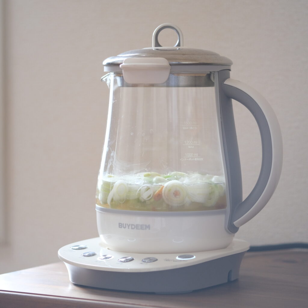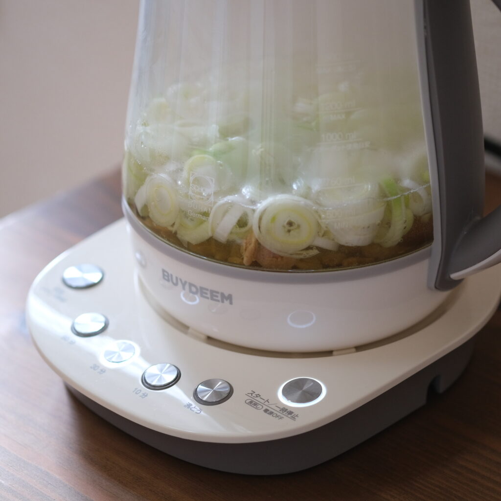 ❷BUYDEEM薬膳マルチポットに①、干し海老、鶏がらスープ顆粒、水を入れて蓋をし、30分ボタンとスタートを押す。