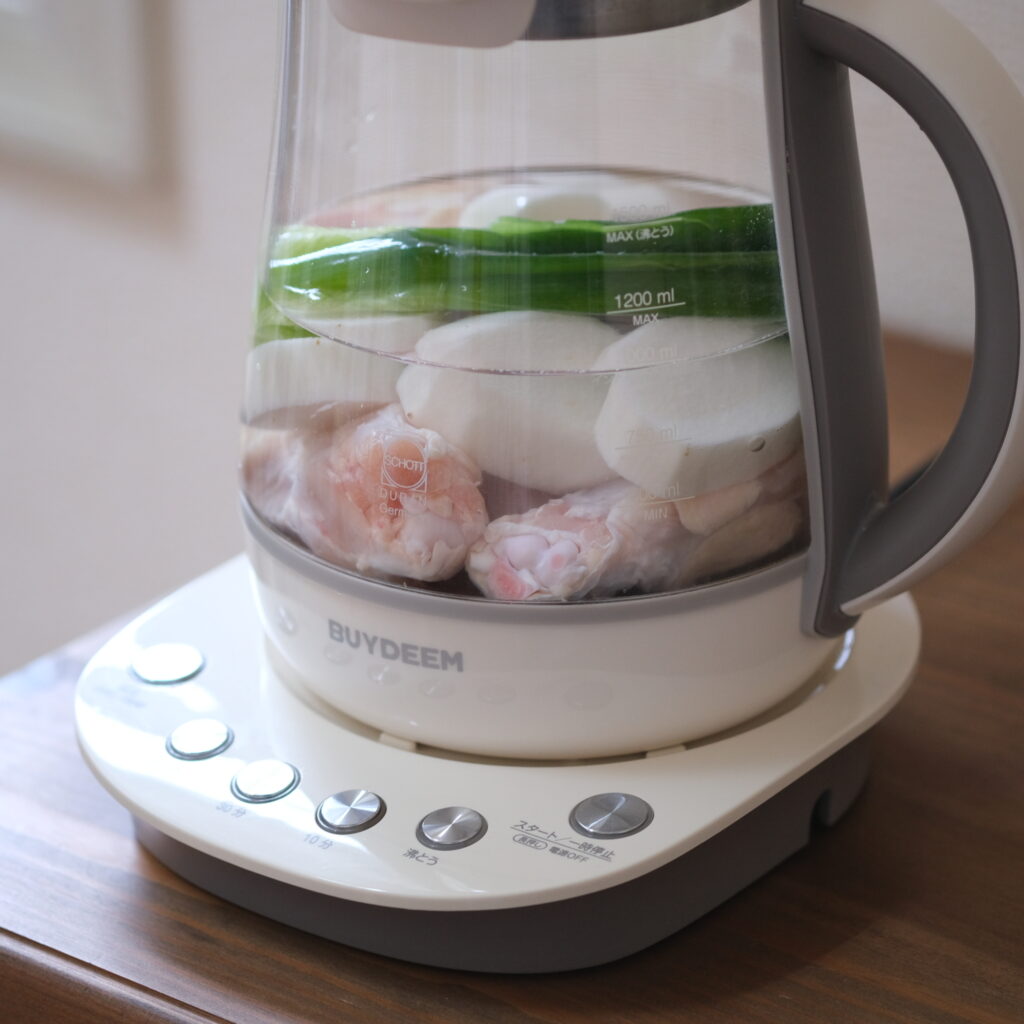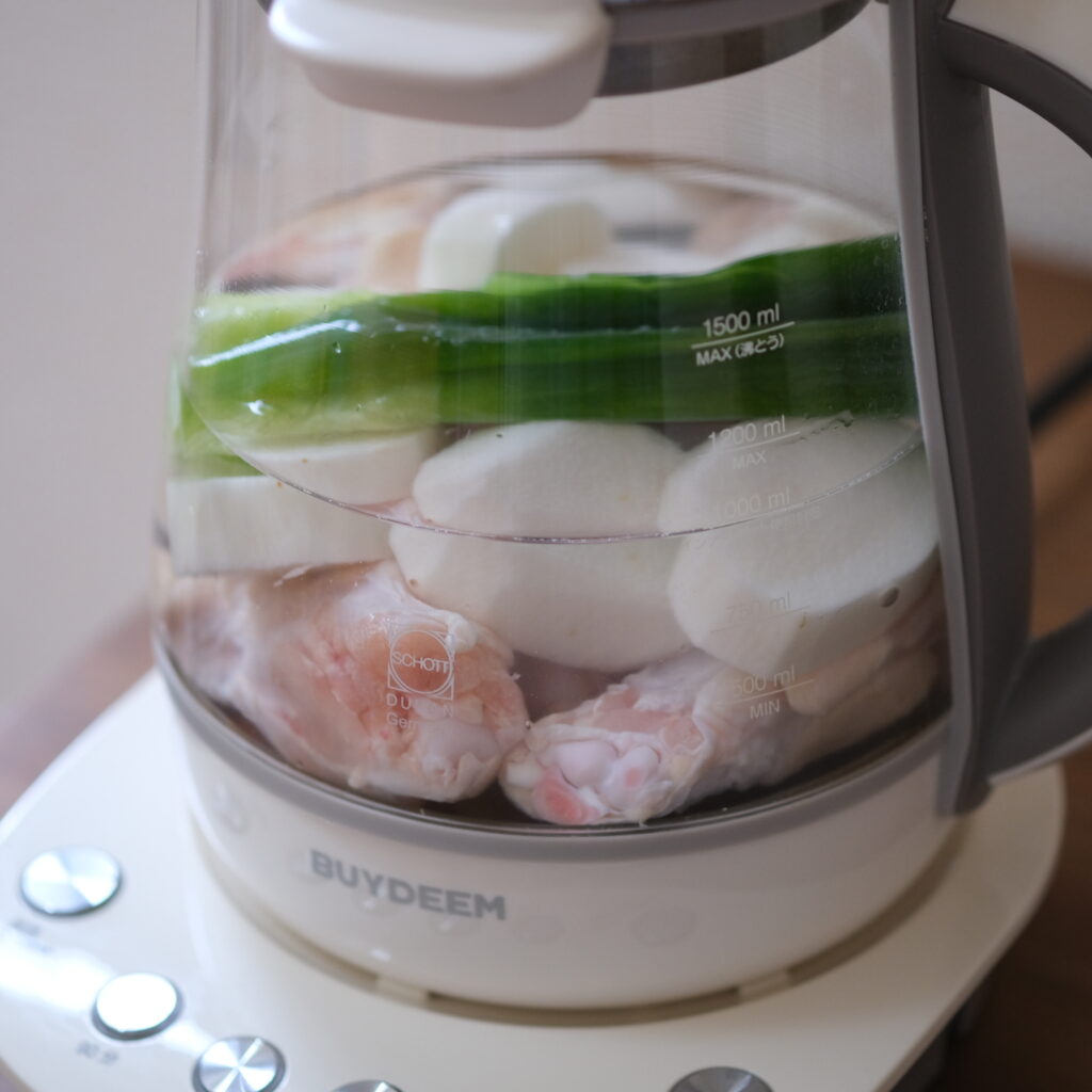 ❷BUYDEEM薬膳マルチポットに★の材料と塩ひとつまみを入れ、蓋をして30分ボタンとスタートを押す。アクが浮いてきたら取り除く。