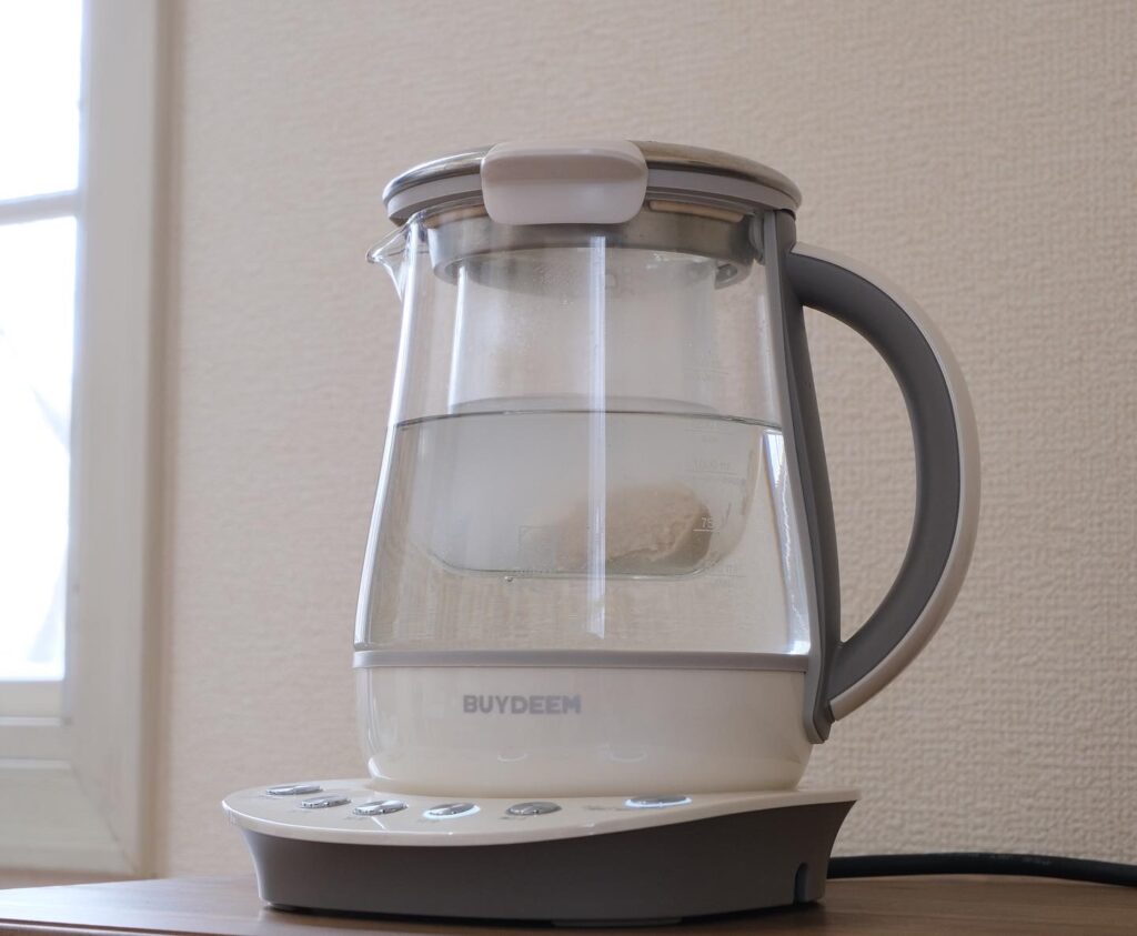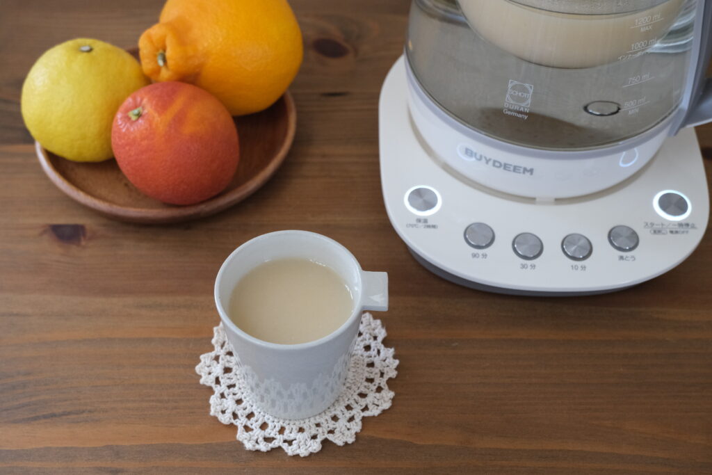 ❶BUYDEEM薬膳マルチポット本体に1000mlのラインまで水を注ぐ。インナーポットをセットして、酒粕と水を入れて混ぜ、蓋をせずに10分ボタンとスタートを押す。