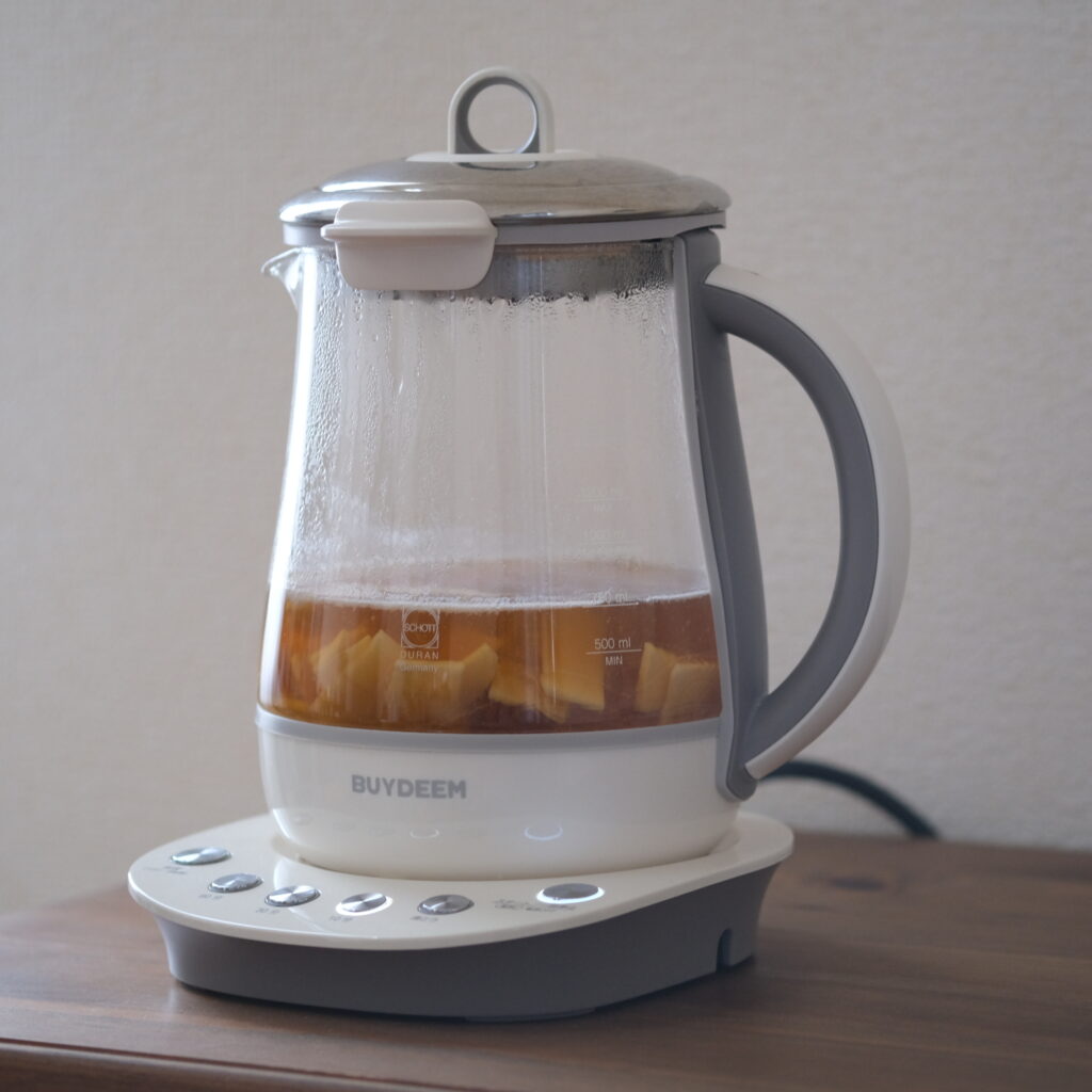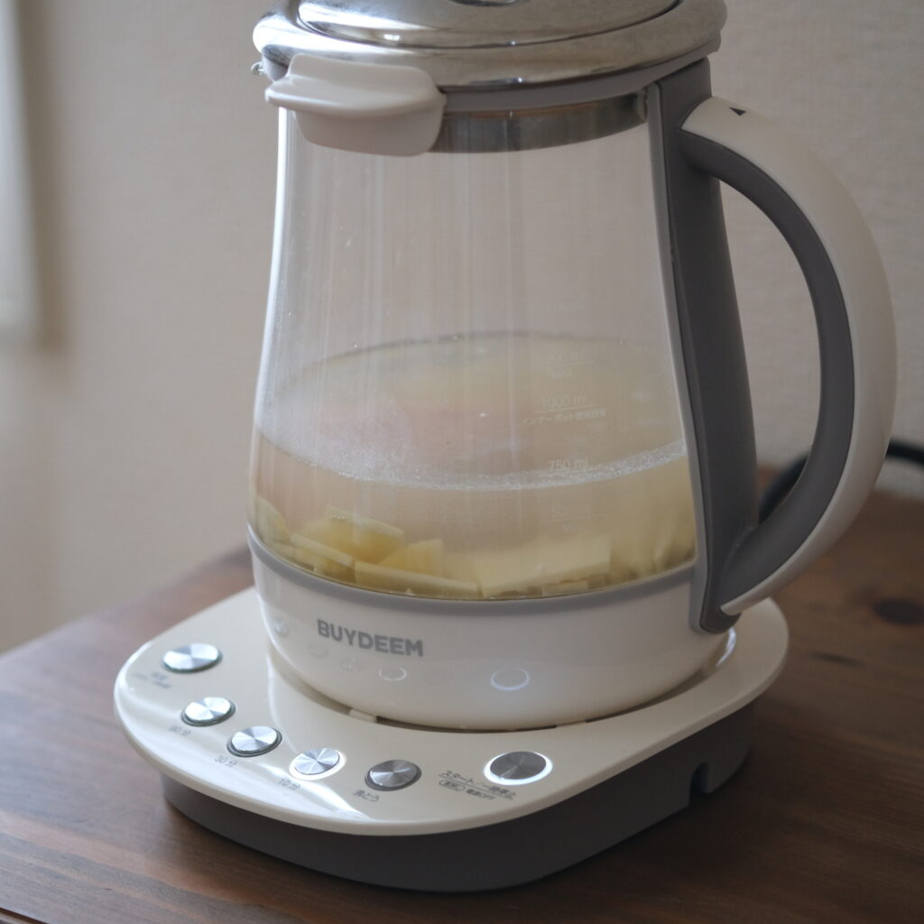 BUYDEEM薬膳マルチポット本体に、外皮を剥いて縦に切れ目を入れたタケノコ、こめぬか、水を入れ、90分ボタンとスタートを押す(詳しくはhttps://cookpad.com/recipe/6170824 )