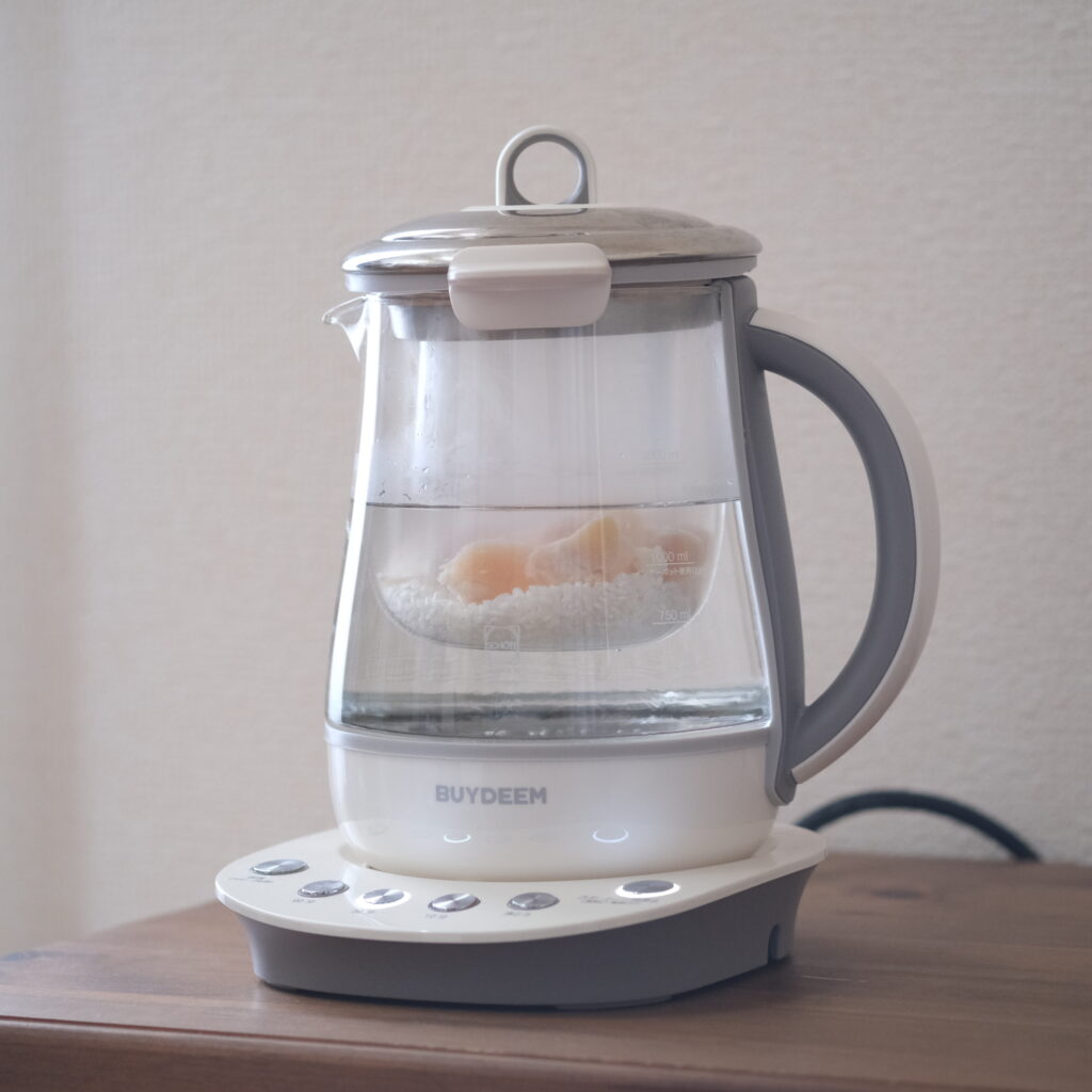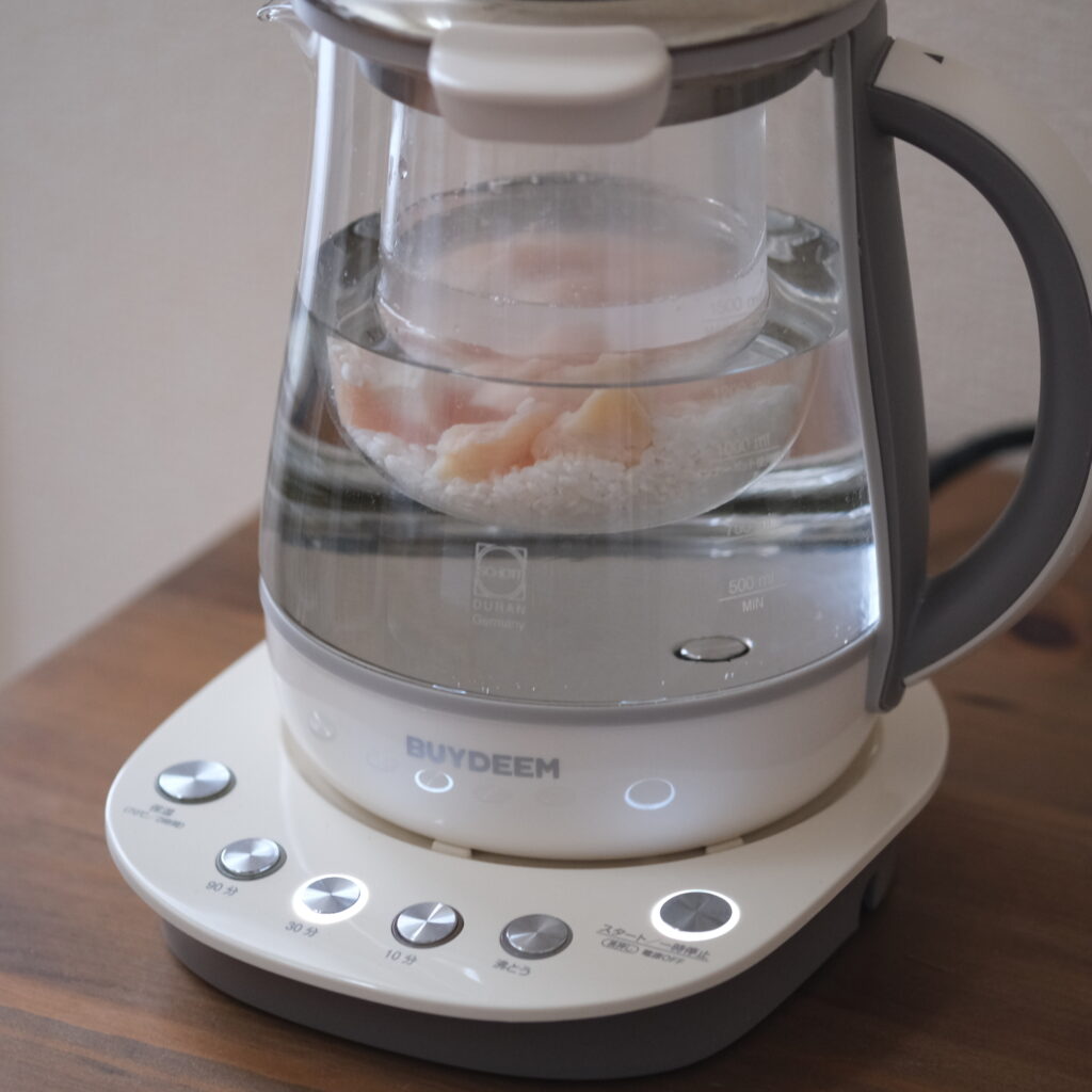 ❷ BUYDEEM薬膳マルチポット本体に1000mlのラインまで水を注ぐ。インナーポットをセットして、米、鶏肉、酒、水の順に入れ、蓋をして30分ボタンとスタートを押す。