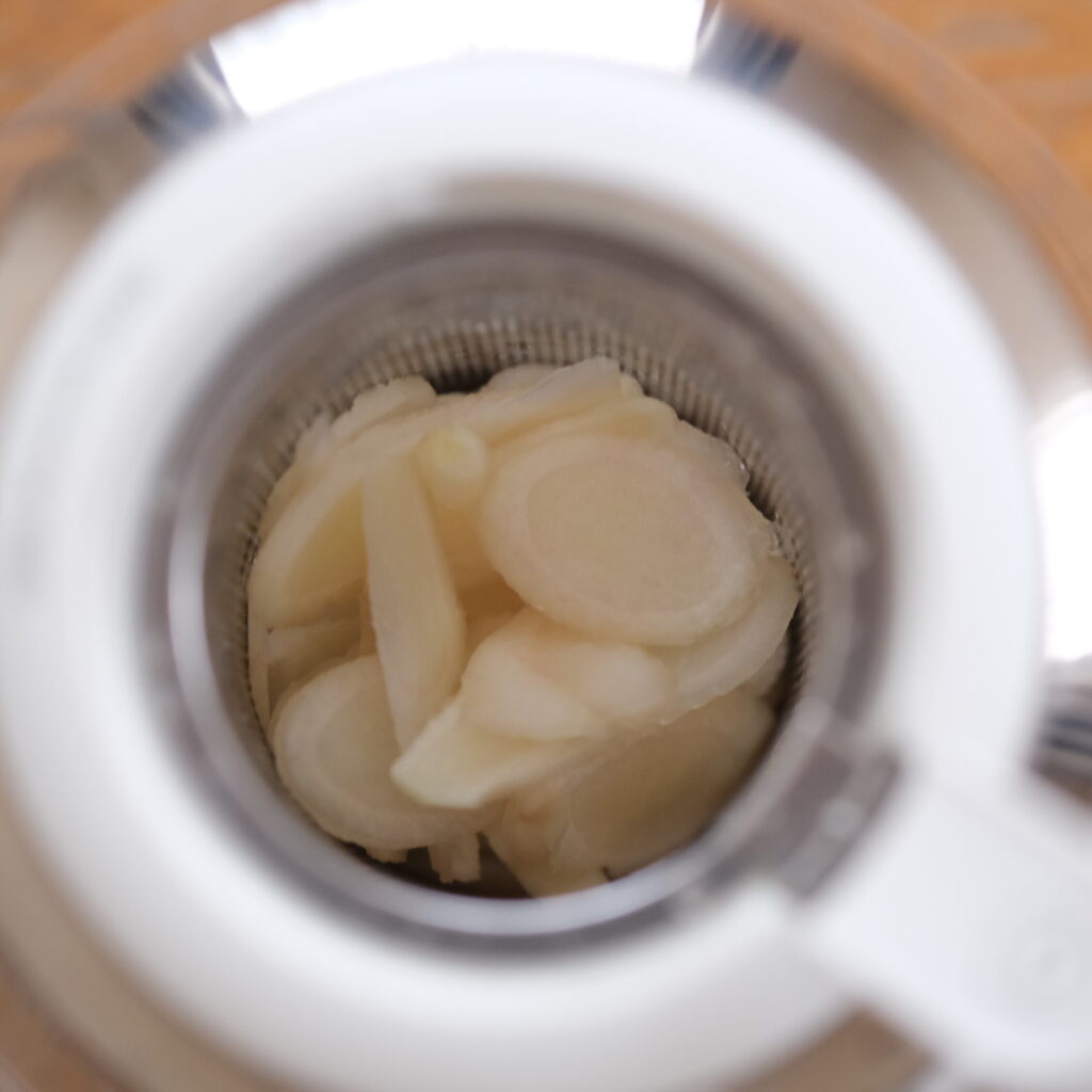 ❹アラームが鳴ったら、ティーフィルターの新生姜を取り出し、紅茶葉を入れて3〜4分蒸らす。お好みで蜂蜜や黒糖を加えていただく。