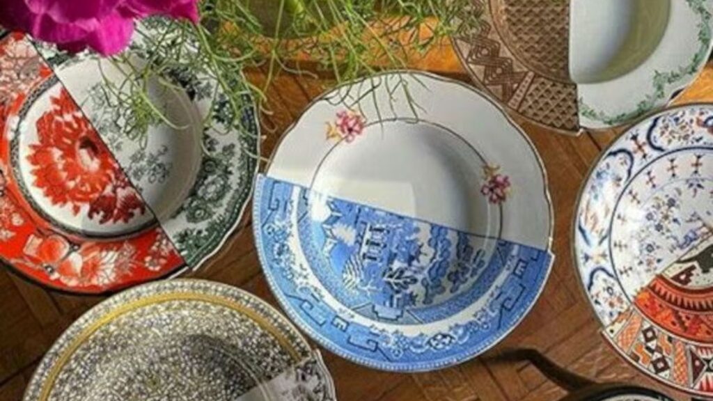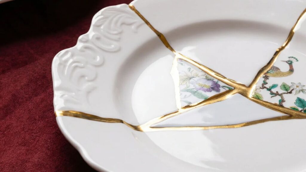 割れた陶器を金で修復したようなデザインが特徴で、不完全さの美しさを表現したアート性の高い食器です。