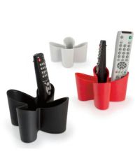 四隅にそれぞれリモコンを置いて、真ん中の隙間にも1個置いて、5個のリモコンを収納していますが、スッキリと見えます。 この形は傘置きでも似たようなものがありますし、理にかなっているのでしょうね。